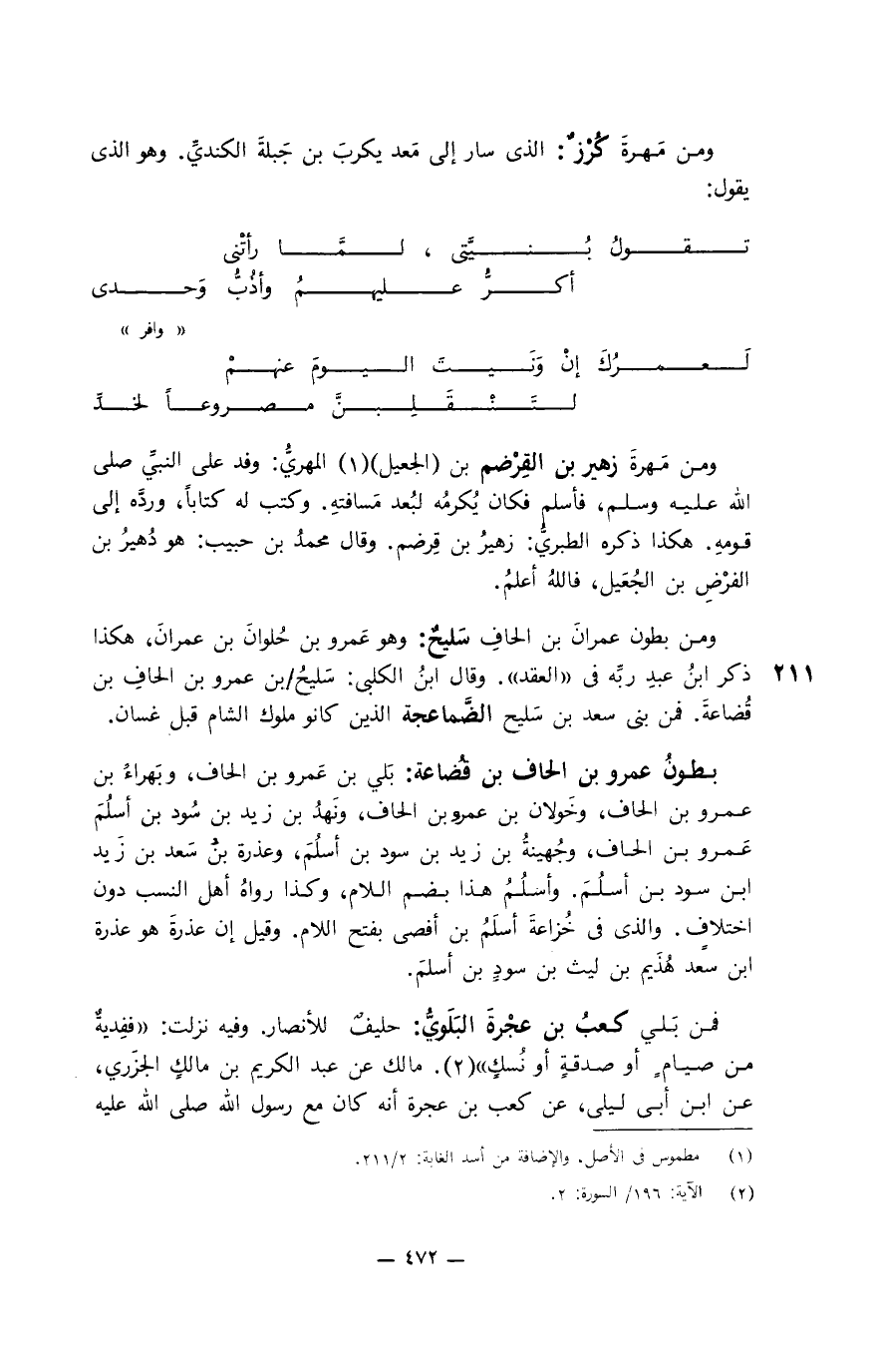ومن جُهينة بن زيد أخى نهدٍ عُقبةُ بن عامر الجُهَنيُّ: من مشاهير الصحابة، وروى عنه، منهم: جابرٌ وابنُ عباس وأبو أُمامةَ. وسكن مصر، وكان والياً عليها، وابتنى بها دارا، ومات في آخر خلافة معاوية. ويُكني أبا حمّاد. وأما الرُواةُ عنه من التابعين فكثير. كان يُكثر الرَّمي لما سمع من النبي صلى الله عليه وسلم فيه. ومات وترك خمسين قوسا بجعابها ونبالها. وشهد صِفِّين مع معاوية. وكان يخضبُ بالسواد.