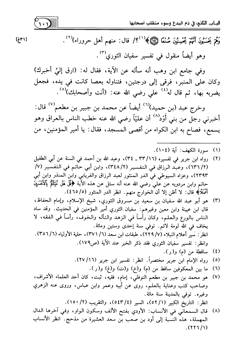 (¬2) رواه ابن جرير في تفسيره (16/ 33 ـ 34)، وعبد الله بن أحمد في السنة عن أبي الطفيل (2/ 636)، وعبد الرزاق في التفسير (2/ 348)، وابن أبي حاتم في التفسير (7/ 2393)، وعزاه السيوطي في الدر المنثور لعبد الرزاق والفريابي وابن المنذر وابن أبي حاتم وابن مردويه عن علي رضي الله عنه أنه سئل عن هَذِهِ الْآيَةِ {قُلْ هَلْ نُنَبِّئُكُمْ بِالأَخْسَرَينِ أَعْمَالاً *} قال: لا أظن إلا أن الخوارج منهم. انظر الدر المنثور (5/ 465).