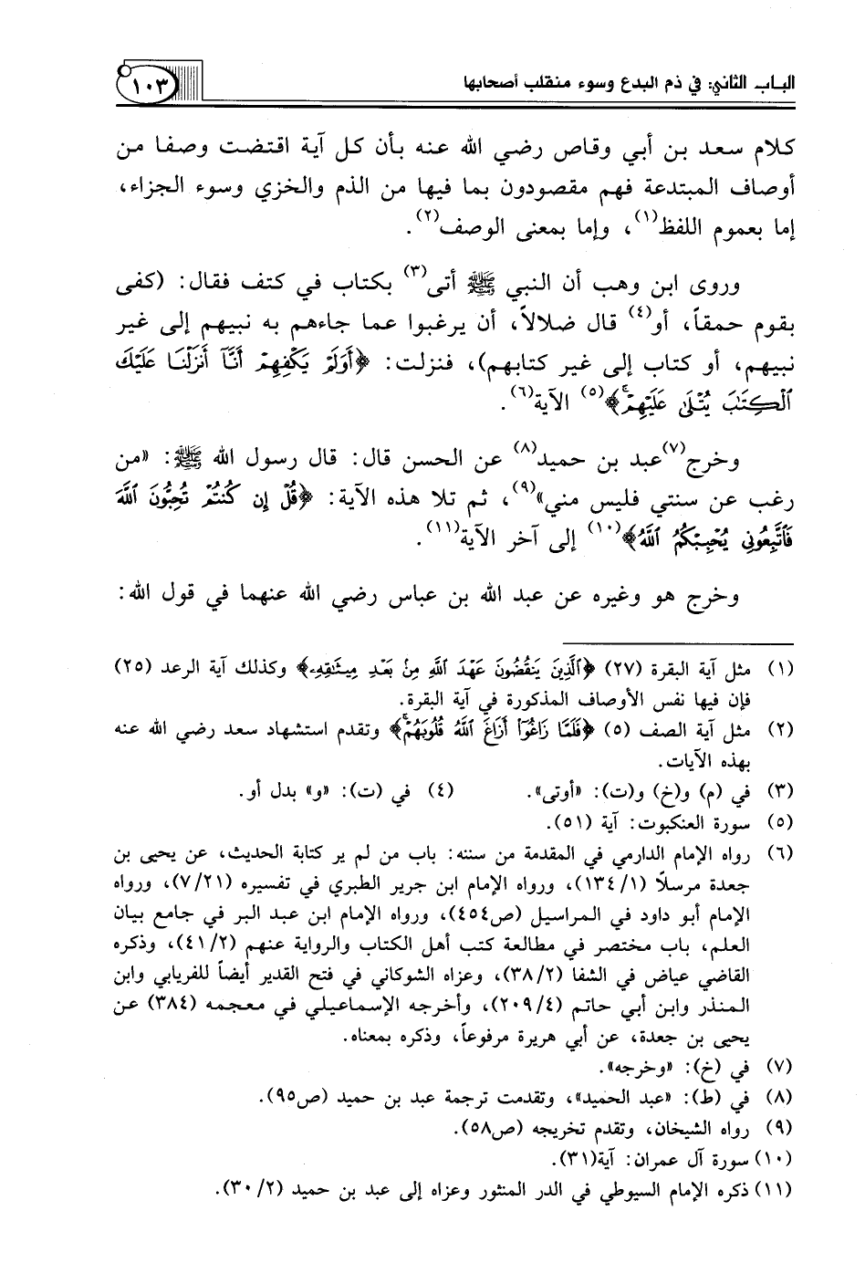 كلام سَعْدِ بْنِ أَبِي وَقَّاصٍ رَضِيَ اللَّهُ عَنْهُ بِأَنَّ كُلَّ آيَةٍ اقْتَضَتْ وَصْفًا مِنْ أَوْصَافِ المبتدعة فهم مقصودون بِمَا فِيهَا مِنَ الذَّمِّ وَالْخِزْيِ وَسُوءِ الْجَزَاءِ، إِمَّا بِعُمُومِ اللَّفْظِ (¬1)، وَإِمَّا بِمَعْنَى الْوَصْفِ (¬2).