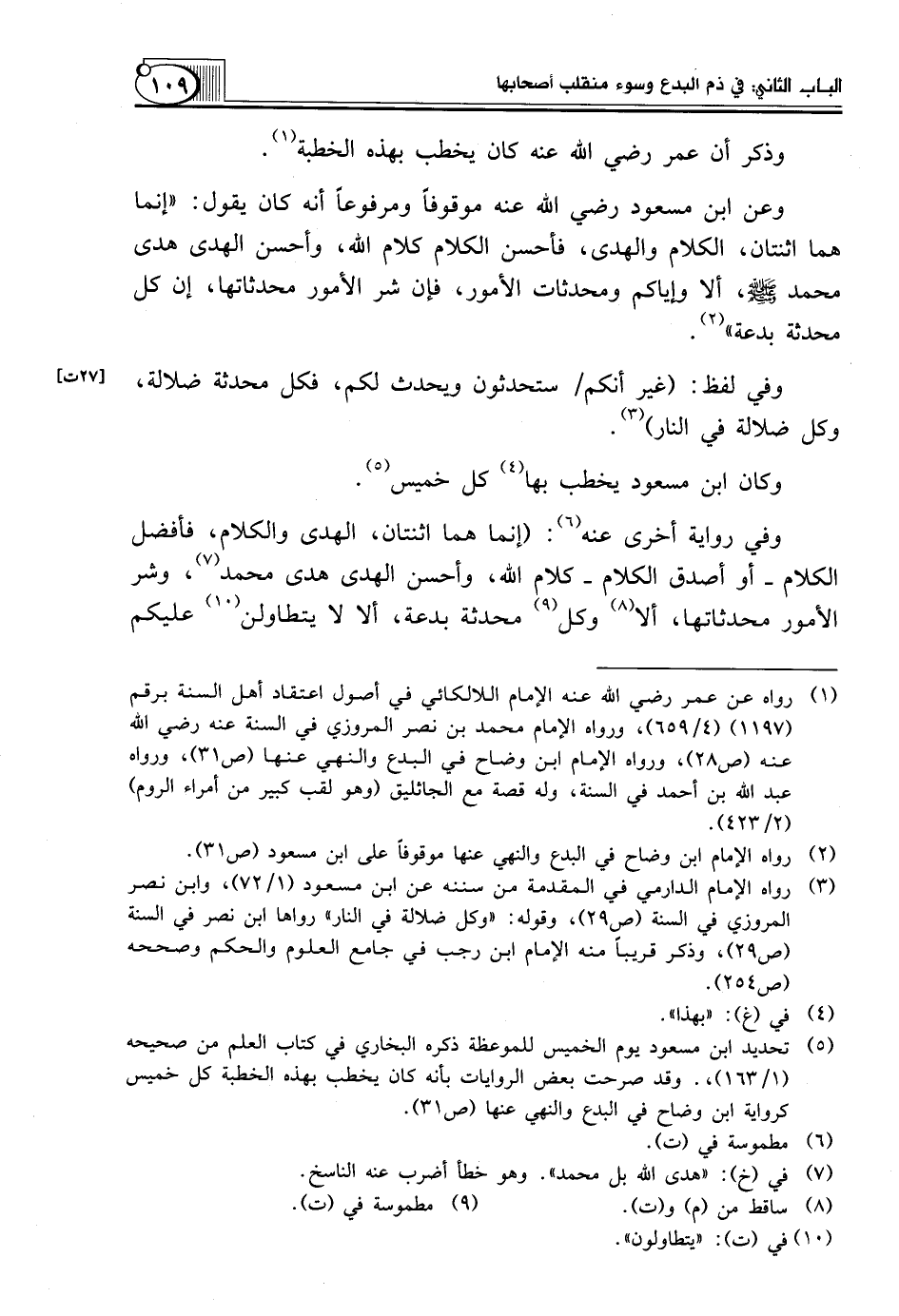 وعن ابن مسعود رضي الله عنه مَوْقُوفًا وَمَرْفُوعًا أَنَّهُ كَانَ يَقُولُ: "إِنَّمَا هُمَا اثْنَتَانِ، الْكَلَامُ وَالْهُدَى، فَأَحْسَنُ الْكَلَامِ كَلَامُ اللَّهِ، وأحسن الهدى هدى محمد صلّى الله عليه وسلّم، أَلَا وَإِيَّاكُمْ وَمُحْدَثَاتِ الْأُمُورِ، فَإِنَّ شَرَّ الْأُمُورِ مُحْدَثَاتُهَا، إِنَّ كُلَّ مُحْدَثَةٍ بِدْعَةٌ" (¬2).