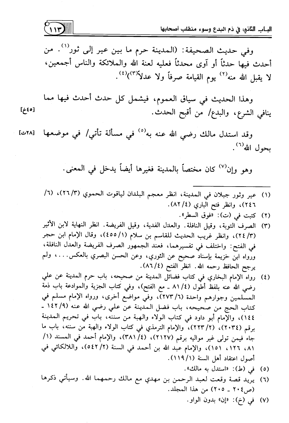 وَفِي حَدِيثِ الصَّحِيفَةِ: (الْمَدِينَةُ حَرَمٌ مَا بَيْنَ عَيْرٍ إِلَى ثَوْرٍ (¬1). مَنْ أَحْدَثَ فِيهَا حَدَثًا أَوْ آوَى مُحْدِثًا فَعَلَيْهِ لَعْنَةُ اللَّهِ وَالْمَلَائِكَةِ وَالنَّاسِ أَجْمَعِينَ، لَا يَقْبَلُ اللَّهُ مِنْهُ (¬2) يَوْمَ الْقِيَامَةِ صَرْفًا وَلَا عَدْلًا (¬3)) (¬4).