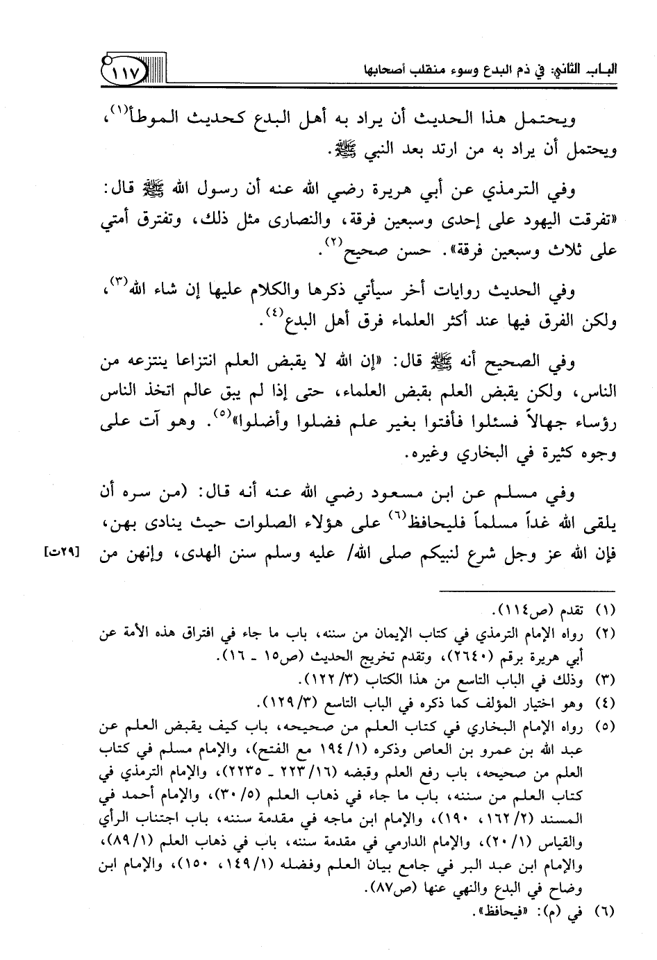 وَفِي الْحَدِيثِ رِوَايَاتٌ أُخَرُ سَيَأْتِي ذِكْرُهَا وَالْكَلَامُ عَلَيْهَا إِنْ شَاءَ اللَّهُ (¬3)، وَلَكِنَّ الْفِرَقَ فِيهَا عِنْدَ أَكْثَرِ الْعُلَمَاءِ فِرَقُ أَهْلِ الْبِدَعِ (¬4).
