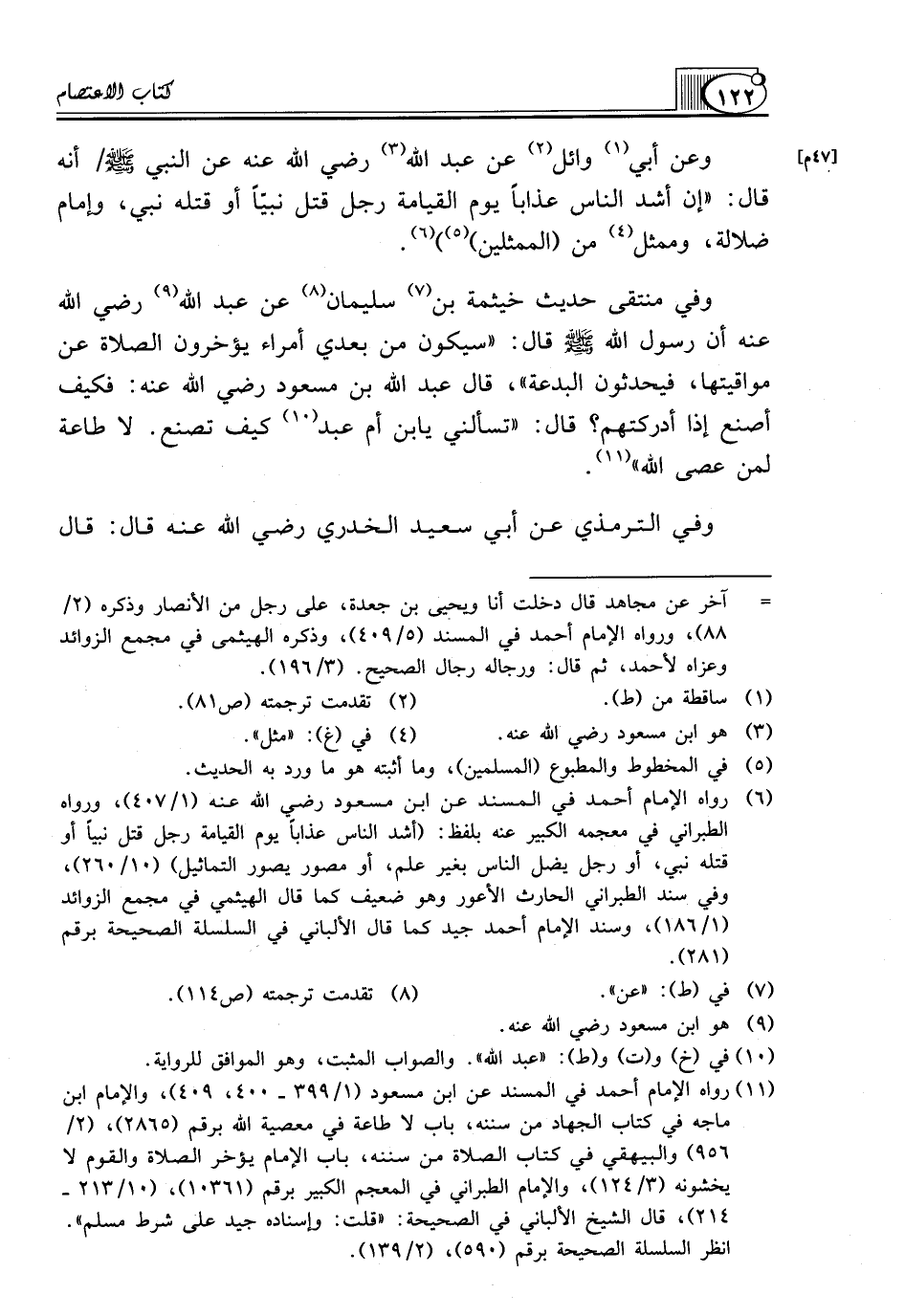 (¬6) رواه الإمام أحمد في المسند عن ابن مسعود رضي الله عنه (1/ 407)، ورواه الطبراني في معجمه الكبير عنه بلفظ: (أَشَدَّ النَّاسِ عَذَابًا يَوْمَ الْقِيَامَةِ رَجُلٌ قَتَلَ نبياً أو قتله نبي، أو رجل يضل الناس بغير علم، أو مصور يصور التماثيل) (10/ 260)، وفي سند الطبراني الحارث الأعور وهو ضعيف كما قال الهيثمي في مجمع الزوائد (1/ 186)، وسند الإمام أحمد جيد كما قال الألباني في السلسلة الصحيحة برقم (281).
