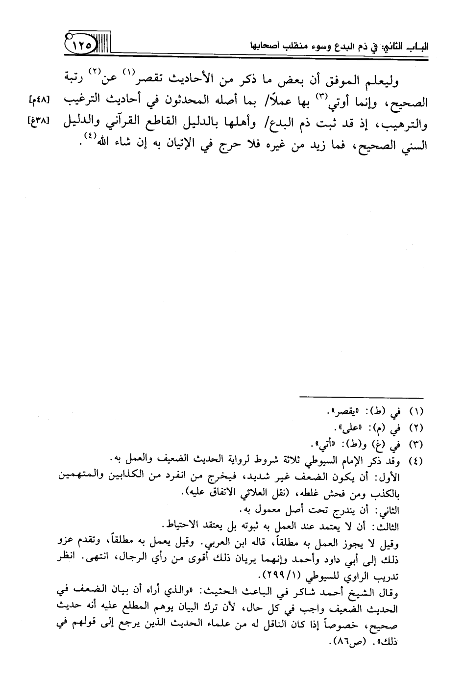 وَلْيَعْلَمِ الْمُوَفَّقُ أَنَّ بَعْضَ مَا ذُكِرَ مِنَ الأحاديث تقصر (¬1) عن (¬2) رتبة الصحيح، وإنما أوتي (¬3) بِهَا عَمَلًا بِمَا أَصَّلَهُ الْمُحَدِّثُونَ فِي أَحَادِيثِ الترغيب والترهيب، إذ قَدْ ثَبَتَ ذَمُّ الْبِدَعِ وَأَهْلِهَا بِالدَّلِيلِ الْقَاطِعِ الْقُرْآنِيِّ وَالدَّلِيلِ السُّنِّيِّ الصَّحِيحِ، فَمَا زِيدَ مِنْ غَيْرِهِ فَلَا حَرَجَ فِي الْإِتْيَانِ بِهِ إِنْ شاء الله (¬4).
