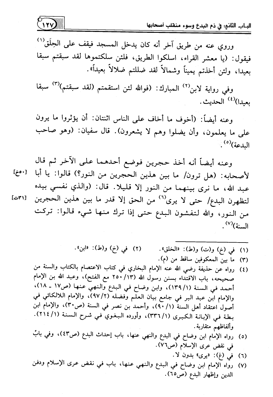 (¬4) رواه عن حذيفة رضي الله عنه الإمام البخاري في كتاب الاعتصام بالكتاب والسنة من صحيحه، باب الاقتداء بسنن رسول الله (13/ 250 مع الفتح)، وعبد الله بن الإمام أحمد في السنة (1/ 139)، وابن وضاح في البدع والنهي عنها (ص17 ـ 18)، والإمام ابن عبد البر في جامع بيان العلم وفضله (2/ 97)، والإمام اللالكائي في أصول اعتقاد أهل السنة (1/ 90)، وأحمد بن نصر في السنة (ص30)، والإمام ابن بطة في الإبانة الكبرى (1/ 336)، وأورده البغوي في شرح السنة (1/ 214). وألفاظهم متقاربة.