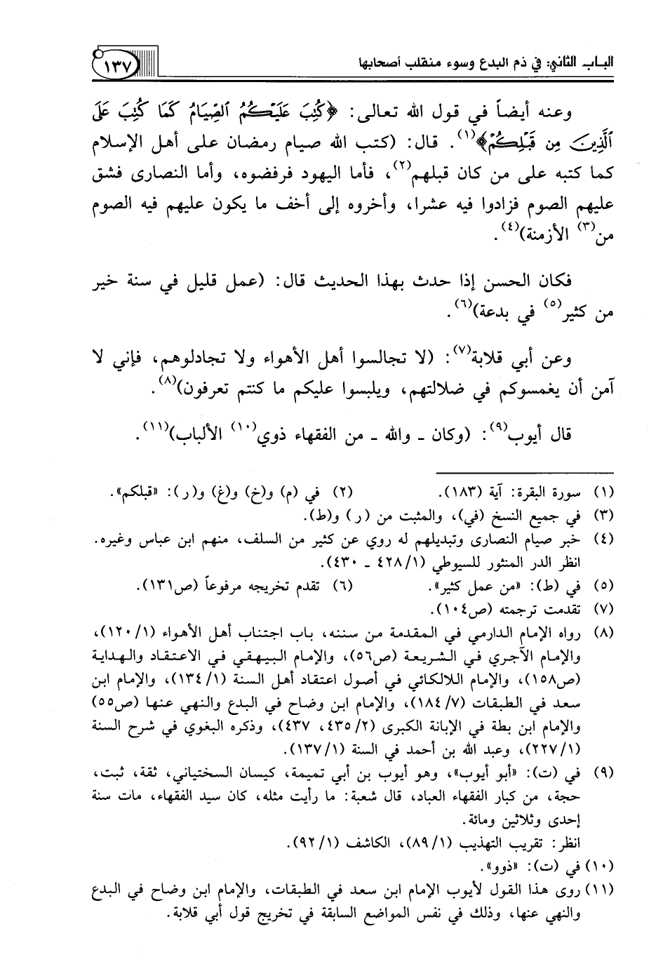 (¬11) روى هذا القول لأيوب الإمام ابن سعد في الطبقات، والإمام ابن وضاح في البدع والنهي عنها، وذلك في نفس المواضع السابقة في تخريج قول أبي قلابة.