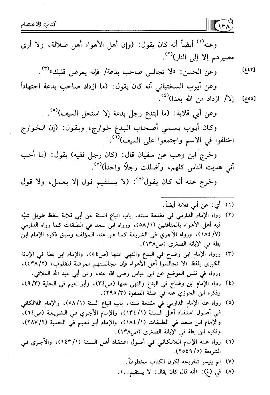 (¬2) رواه الإمام الدارمي في مقدمة سننه، باب اتباع السنة عن أبي قلابة بلفظ طويل شبَّه فيه أهل الأهواء بالمنافقين (1/ 58)، ورواه ابن سعد في الطبقات كما رواه الدارمي (7/ 184)، ورواه الآجري في الشريعة كما هو عند المؤلف (ص64)، وذكره الإمام ابن بطة في الإبانة الصغرى (ص138).