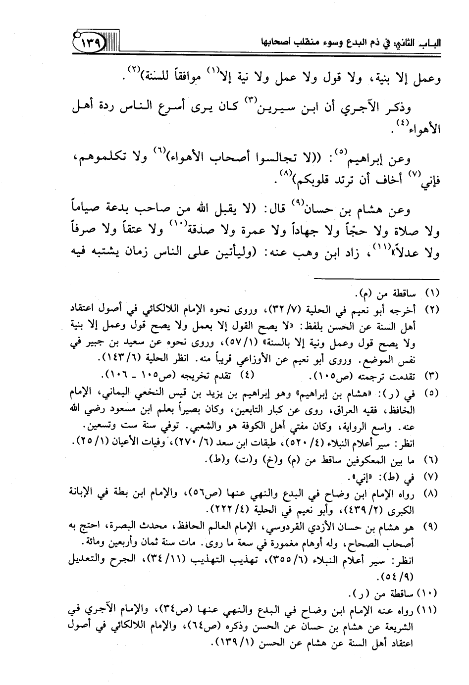 (¬11) رواه عنه الإمام ابن وضاح في البدع والنهي عنها (ص34)، والإمام الآجري في الشريعة عن هشام بن حسان عن الحسن وذكره (ص64)، والإمام اللالكائي في أصول اعتقاد أهل السنة عن هشام عن الحسن (1/ 139).