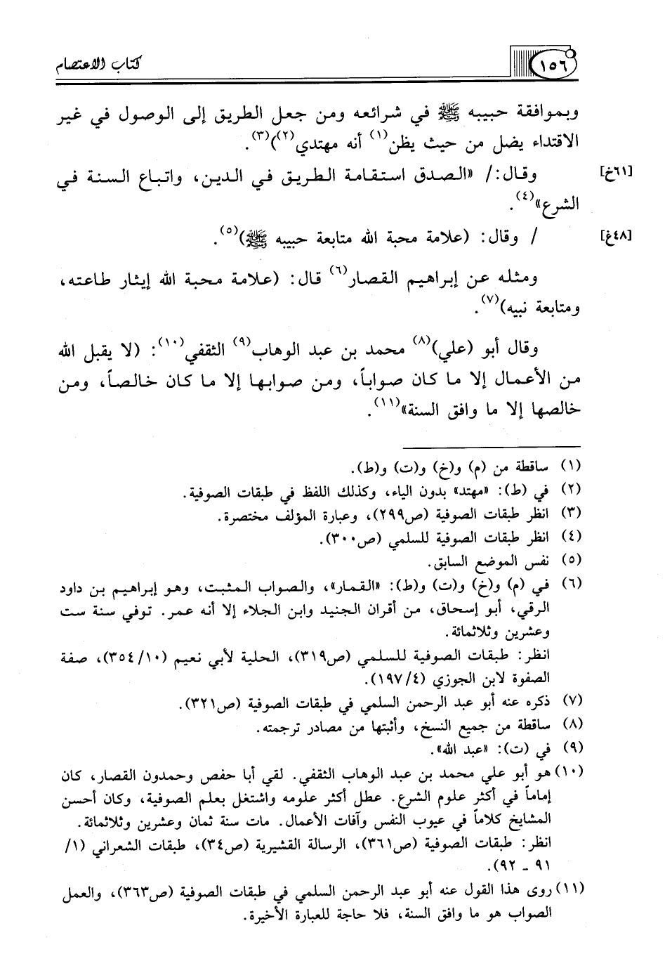 (¬10) هو أبو علي محمد بن عبد الوهاب الثقفي. لقي أبا حفص وحمدون القصار، كان إماماً في أكثر علوم الشرع. عطل أكثر علومه واشتغل بعلم الصوفية، وكان أحسن المشايخ كلاماً في عيوب النفس وآفات الأعمال. مات سنة ثمان وعشرين وثلاثمائة.