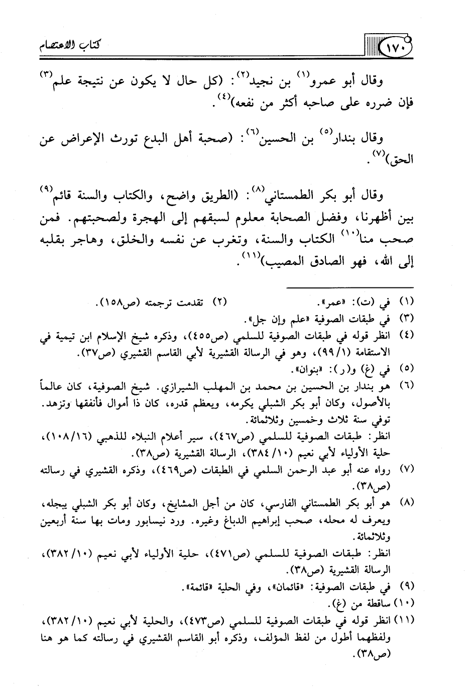 (¬4) انظر قوله في طبقات الصوفية للسلمي (ص455)، وذكره شيخ الإسلام ابن تيمية في الاستقامة (1/ 99)، وهو في الرسالة القشيرية لأبي القاسم القشيري (ص37).