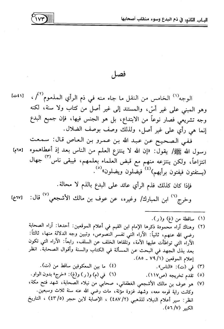 فَفِي الصَّحِيحِ عَنْ عَبْدِ اللَّهِ بْنِ عَمْرِو بْنِ الْعَاصِ قَالَ: سَمِعْتُ رَسُولَ اللَّهِ صَلَّى اللَّهُ عَلَيْهِ وَسَلَّمَ يَقُولُ: "إِنَّ اللَّهَ لَا يَنْتَزِعُ الْعِلْمَ مِنَ النَّاسِ بَعْدَ إِذْ أَعْطَاهُمُوهُ انْتِزَاعًا، وَلَكِنْ يَنْتَزِعُهُ مِنْهُمْ مَعَ قَبْضِ الْعُلَمَاءِ بِعِلْمِهِمْ، فَيَبْقَى نَاسٌ (¬3) جُهَّالٌ (يَسْتَفْتُونَ فَيُفْتُونَ بِرَأْيِهِمْ) (¬4) فَيَضِلُّونَ وَيُضِلُّونَ" (¬5).