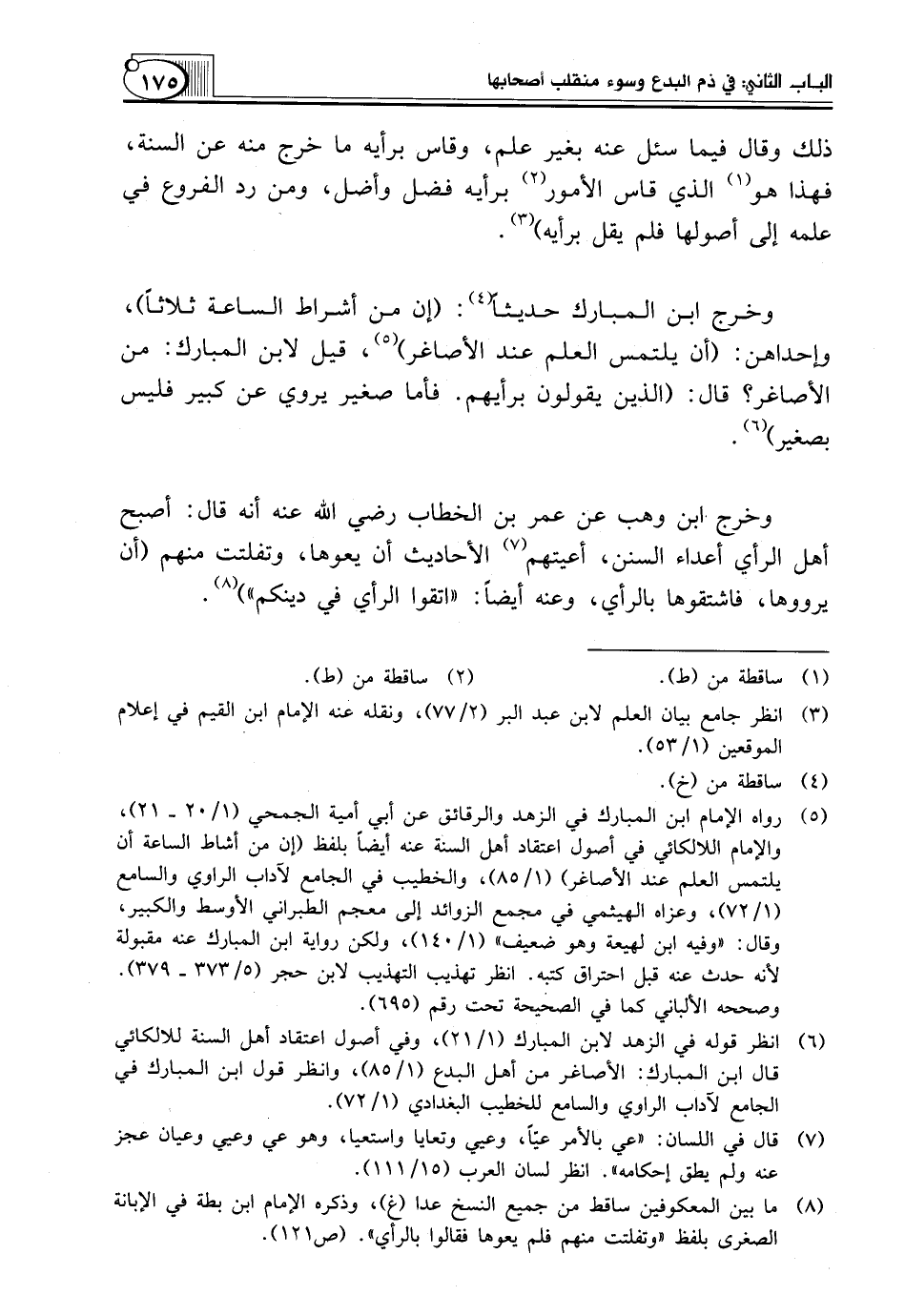(¬6) انظر قوله في الزهد لابن المبارك (1/ 21)، وفي أصول اعتقاد أهل السنة للالكائي قال ابن المبارك: الأصاغر من أهل البدع (1/ 85)، وانظر قول ابن المبارك في الجامع لآداب الراوي والسامع للخطيب البغدادي (1/ 72).