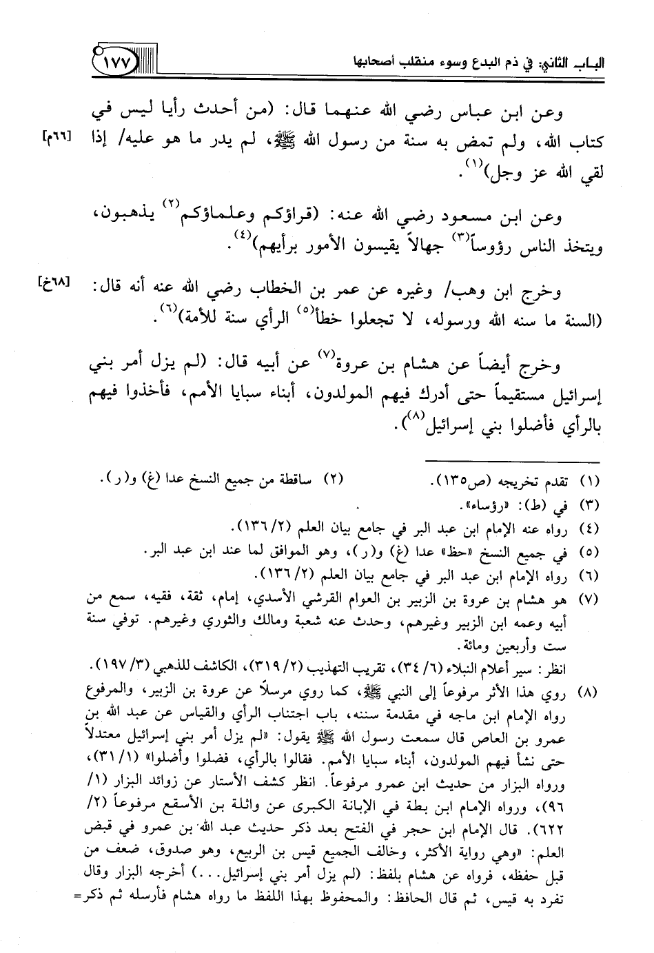 (¬8) روي هذا الأثر مرفوعاً إلى النبي صلّى الله عليه وسلّم، كما روي مرسلاً عن عروة بن الزبير، والمرفوع رواه الإمام ابن ماجه في مقدمة سننه، باب اجتناب الرأي والقياس عن عبد الله بن عمرو بن العاص قال سمعت رسول الله صلّى الله عليه وسلّم يقول: "لم يزل أمر بني إسرائيل معتدلاً حتى نشأ فيهم المولدون، أبناء سبايا الأمم. فقالوا بالرأي، فضلوا وأضلوا" (1/ 31)، ورواه البزار من حديث ابن عمرو مرفوعاً. انظر كشف الأستار عن زوائد البزار (1/ 96)، ورواه الإمام ابن بطة في الإبانة الكبرى عن واثلة بن الأسقع مرفوعاً (2/ 622). قال الإمام ابن حجر في الفتح بعد ذكر حديث عبد الله بن عمرو في قبض العلم: "وهي رواية الأكثر، وخالف الجميع قيس بن الربيع، وهو صدوق، ضعف من قبل حفظه، فرواه عن هشام بلفظ: (لم يزل أمر بني إسرائيل ... ) أخرجه البزار وقال تفرد به قيس، ثم قال الحافظ: والمحفوظ بهذا اللفظ ما رواه هشام فأرسله ثم ذكر=
