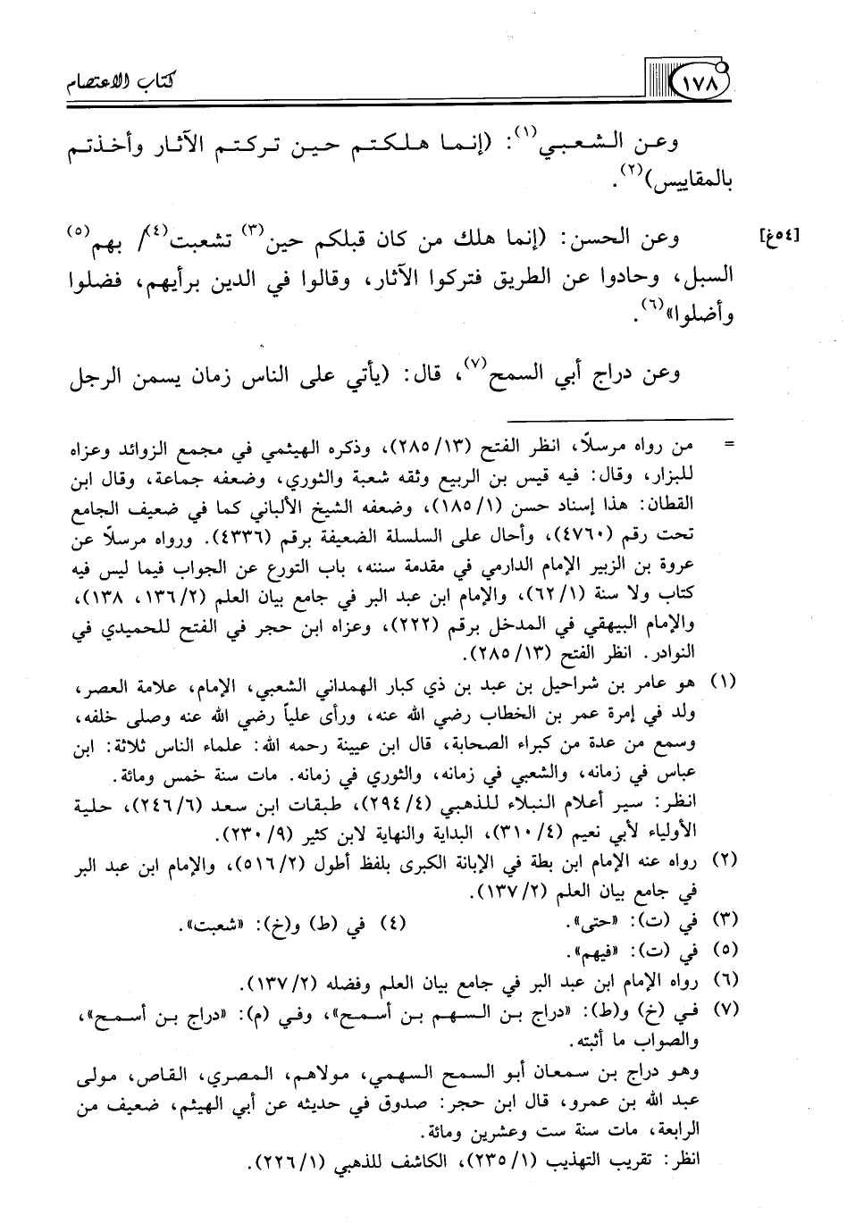 وَعَنِ الشَّعْبِيِّ (¬1): (إِنَّمَا هَلَكْتُمْ حِينَ تَرَكْتُمُ الْآثَارَ وَأَخَذْتُمْ بِالْمَقَايِيسِ) (¬2).