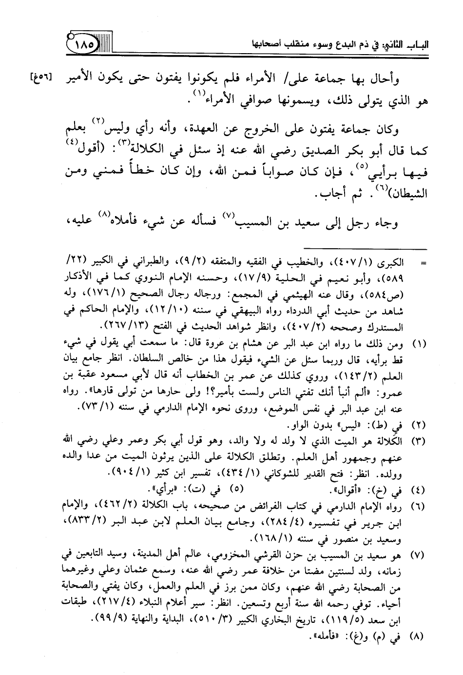 (¬1) ومن ذلك ما رواه ابن عبد البر عن هشام بن عروة قال: ما سمعت أبي يقول في شيء قط برأيه، قال وربما سئل عن الشيء فيقول هذا من خالص السلطان. انظر جامع بيان العلم (2/ 143)، وروي كذلك عن عمر بن الخطاب أنه قال لأبي مسعود عقبة بن عمرو: "ألم أنبأ أنك تفتي الناس ولست بأمير؟! ولى حارها من تولى قارها". رواه عنه ابن عبد البر في نفس الموضع، وروى نحوه الإمام الدارمي في سننه (1/ 73).