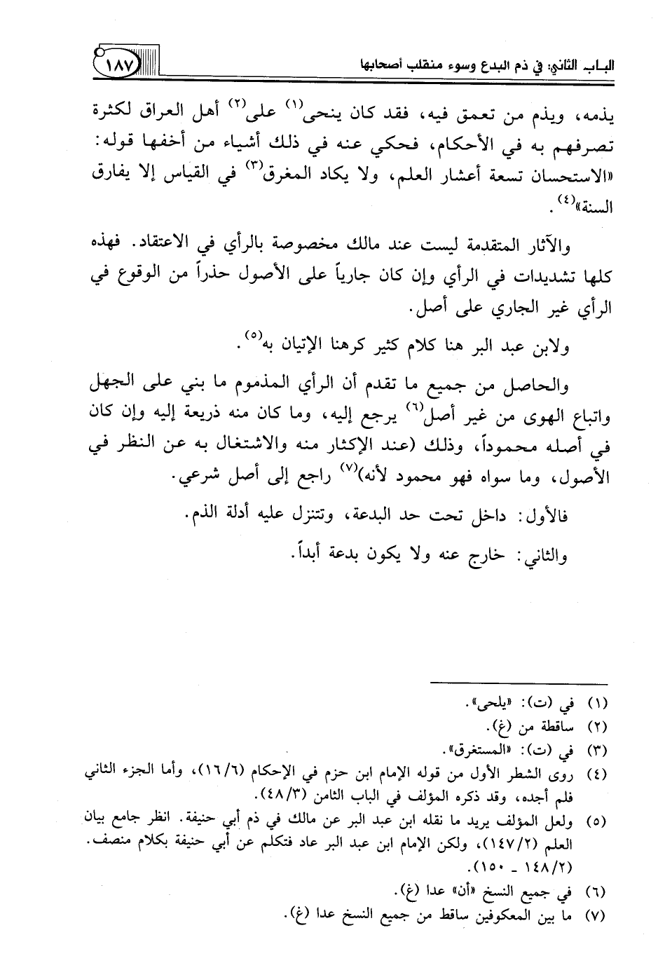 (¬5) ولعل المؤلف يريد ما نقله ابن عبد البر عن مالك في ذم أبي حنيفة. انظر جامع بيان العلم (2/ 147)، ولكن الإمام ابن عبد البر عاد فتكلم عن أبي حنيفة بكلام منصف. (2/ 148 ـ 150).