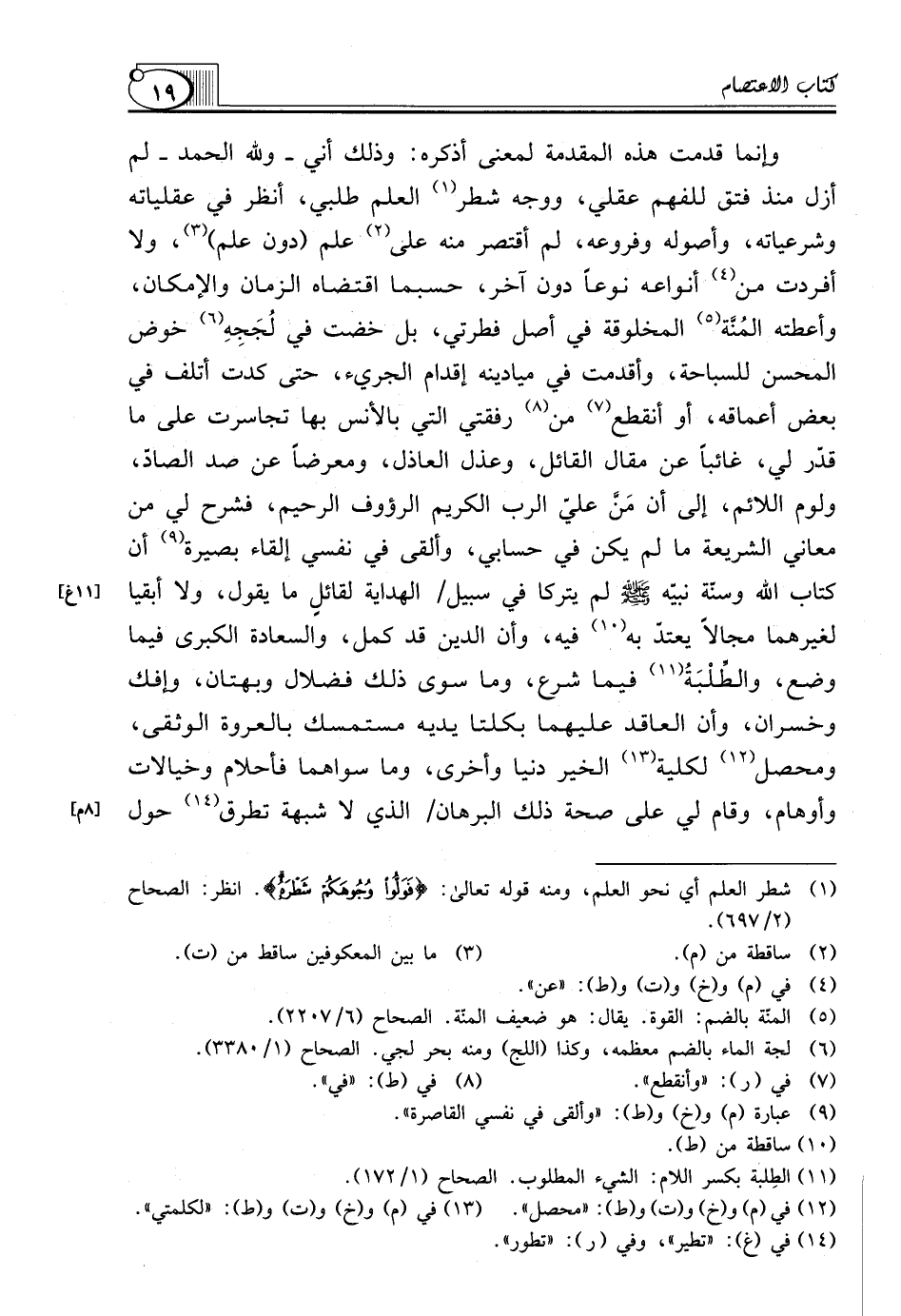 وَإِنَّمَا قَدَّمْتُ هَذِهِ الْمُقَدِّمَةَ لِمَعْنًى أَذْكُرُهُ: وَذَلِكَ أَنِّي ـ وَلِلَّهِ الْحَمْدُ ـ لَمْ أَزَلْ مُنْذُ فَتَقَ لِلْفَهْمِ عَقْلِي، وَوُجِّهَ شَطْرَ (¬1) الْعِلْمِ طَلَبِي، أَنْظُرُ فِي عَقْلِيَّاتِهِ وَشَرْعِيَّاتِهِ، وَأُصُولِهِ وَفُرُوعِهِ، لَمْ أَقْتَصِرْ مِنْهُ عَلَى (¬2) عِلْمٍ (دُونَ عِلْمٍ) (¬3)، وَلَا أَفْرَدْتُ من (¬4) أَنْوَاعِهِ نَوْعًا دُونَ آخَرَ، حَسْبَمَا اقْتَضَاهُ الزَّمَانُ والإمكان، وَأَعْطَتْهُ المُنَّة (¬5) الْمَخْلُوقَةُ فِي أَصْلِ فِطْرَتِي، بَلْ خُضْتُ فِي لُجَجِهِ (¬6) خَوْضَ الْمُحْسِنِ لِلسِّبَاحَةِ، وَأَقْدَمْتُ فِي مَيَادِينِهِ إِقْدَامَ الْجَرِيءِ، حَتَّى كِدْتُ أَتْلَفُ في بعض أعماقه، أو أنقطع (¬7) من (¬8) رُفْقَتِي الَّتِي بِالْأُنْسِ بِهَا تَجَاسَرْتُ عَلَى مَا قُدِّرَ لِي، غَائِبًا عَنْ مَقَالِ الْقَائِلِ، وَعَذْلِ الْعَاذِلِ، وَمُعْرِضًا عَنْ صَدِّ الصَّادِّ، وَلَوْمِ اللَّائِمِ، إلى أن مَنَّ عليّ الرب الكريم الرؤوف الرَّحِيمُ، فَشَرَحَ لِي مِنْ مَعَانِي الشَّرِيعَةِ مَا لَمْ يَكُنْ فِي حِسَابِي، وَأَلْقَى فِي نَفْسِي إلقاء بصيرة (¬9) أن كِتَابِ اللَّهِ وَسُنَّةِ نَبِيِّهِ صَلَّى اللَّهُ عَلَيْهِ وسلّم لَمْ يَتْرُكَا فِي سَبِيلِ الْهِدَايَةِ لقائلٍ مَا يقول، ولا أبقيا لغيرهما مجالاً يعتدّ به (¬10) فِيهِ، وَأَنَّ الدِّينَ قَدْ كَمُلَ، وَالسَّعَادَةَ الْكُبْرَى فِيمَا وَضَعَ، والطِّلْبَةُ (¬11) فِيمَا شَرَعَ، وَمَا سِوَى ذَلِكَ فَضَلَالٌ وَبُهْتَانٌ، وَإِفْكٌ وَخُسْرَانٌ، وَأَنَّ الْعَاقِدَ عليهما بكلتا يديه مستمسك بالعروة الوثقى، ومحصل (¬12) لكلية (¬13) الْخَيْرِ دُنْيَا وَأُخْرَى، وَمَا سِوَاهُمَا فَأَحْلَامٌ وَخَيَالَاتٌ وَأَوْهَامٌ، وَقَامَ لِي عَلَى صِحَّةِ ذَلِكَ الْبُرْهَانُ الذي لا شبهة تطرق (¬14) حول