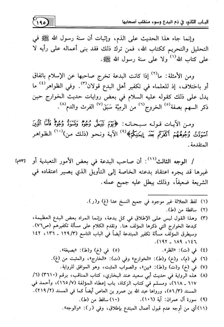 (¬3) وهذا القول ليس على الإطلاق في كل بدعة، وإنما المراد بعض البدع العظيمة، كبدعة الخوارج التي ذكرها المؤلف هنا. وتقدم الكلام على مسألة تكفيرهم (ص79). وسيطرق المؤلف مسألة تكفير المبتدعة أيضاً في الباب التاسع (2/ 194 ـ 198، 202 ـ206، 246 ـ 249).