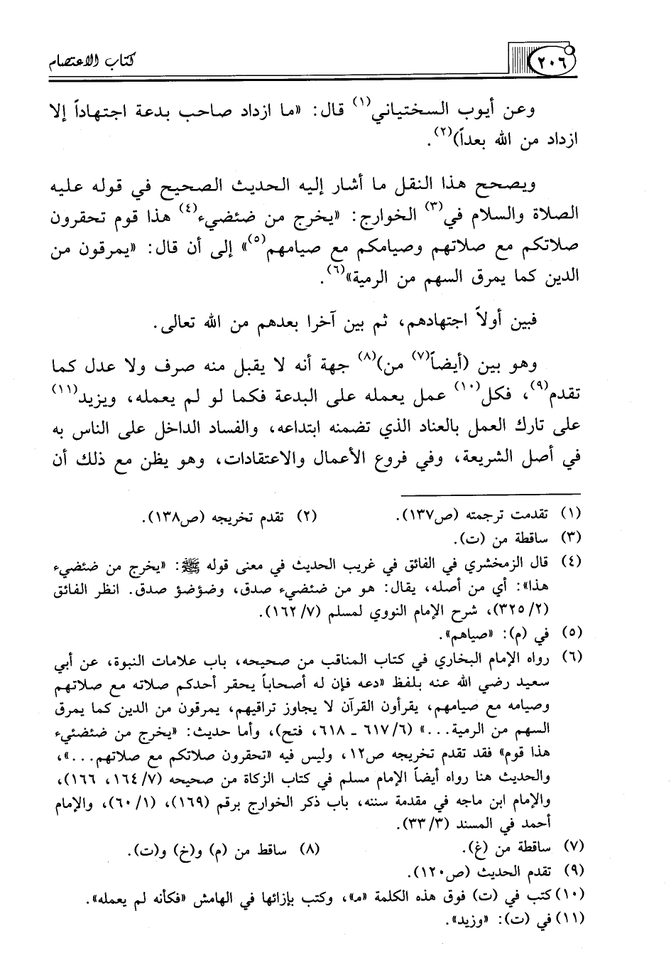 (¬6) رواه الإمام البخاري في كتاب المناقب من صحيحه، باب علامات النبوة، عن أبي سعيد رضي الله عنه بلفظ "دَعْهُ فَإِنَّ لَهُ أَصْحَابًا يُحَقِّرُ أَحَدُكُمْ صَلَاتَهُ مع صلاتهم وصيامه مع صيامهم، يقرأون القرآن لا يجاوز تراقيهم، يَمْرُقُونَ مِنَ الدِّينِ كَمَا يَمْرُقُ السَّهْمُ مِنَ الرمية ... " (6/ 617 ـ 618، فتح)، وأما حديث: "يخرج من ضئضئيء هذا قوم" فقد تقدم تخريجه ص12، وليس فيه "تحقرون صلاتكم مع صلاتهم ... "، والحديث هنا رواه أيضاً الإمام مسلم في كتاب الزكاة من صحيحه (7/ 164، 166)، والإمام ابن ماجه في مقدمة سننه، باب ذكر الخوارج برقم (169)، (1/ 60)، والإمام أحمد في المسند (3/ 33).