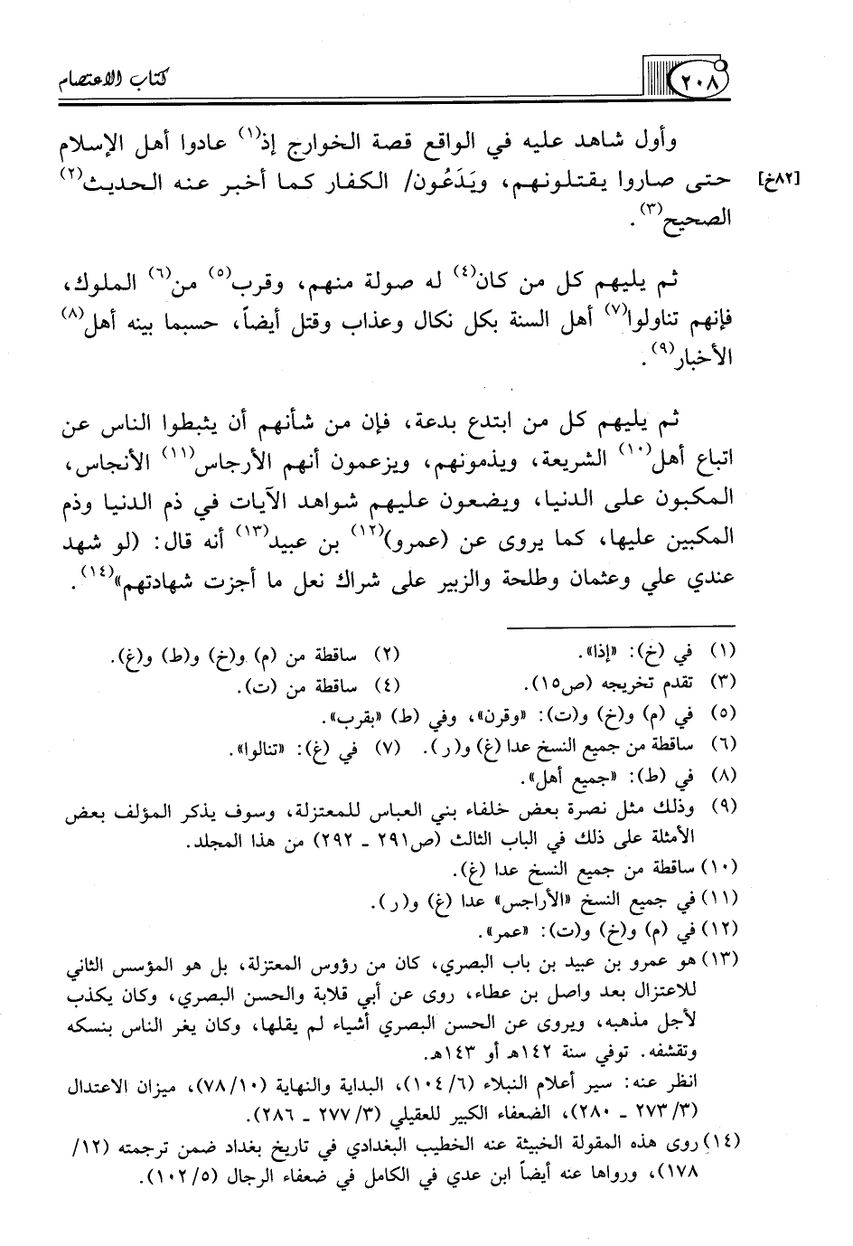 (¬13) هو عمرو بن عبيد بن باب البصري، كان من رؤوس المعتزلة، بل هو المؤسس الثاني للاعتزال بعد واصل بن عطاء، روى عن أبي قلابة والحسن البصري، وكان يكذب لأجل مذهبه، ويروى عن الحسن البصري أشياء لم يقلها، وكان يغر الناس بنسكه وتقشفه. توفي سنة 142هـ أو 143هـ.