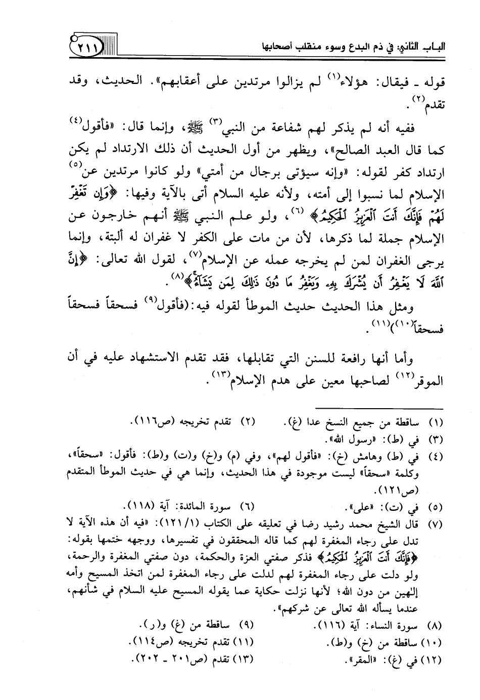(¬7) قال الشيخ محمد رشيد رضا في تعليقه على الكتاب: "فيه أن هذه الآية لا تدل على رجاء المغفرة لهم كما قاله المحققون في تفسيرها، ووجهه ختمها بقوله {فَإِنَّكَ أَنْتَ الْعَزِيزُ الْحَكِيمُ} فذكر صفتي العزة والحكمة، دون صفتي المغفرة والرحمة، ولو دلت على رجاء المغفرة لهم لدلت على رجاء المغفرة لمن اتخذ المسيح وأمه إلهين من دون الله، لأنها نزلت حكاية عما يقوله المسيح عليه السلام في شأنهم، عندما يسأله الله تعالى عن شركهم".