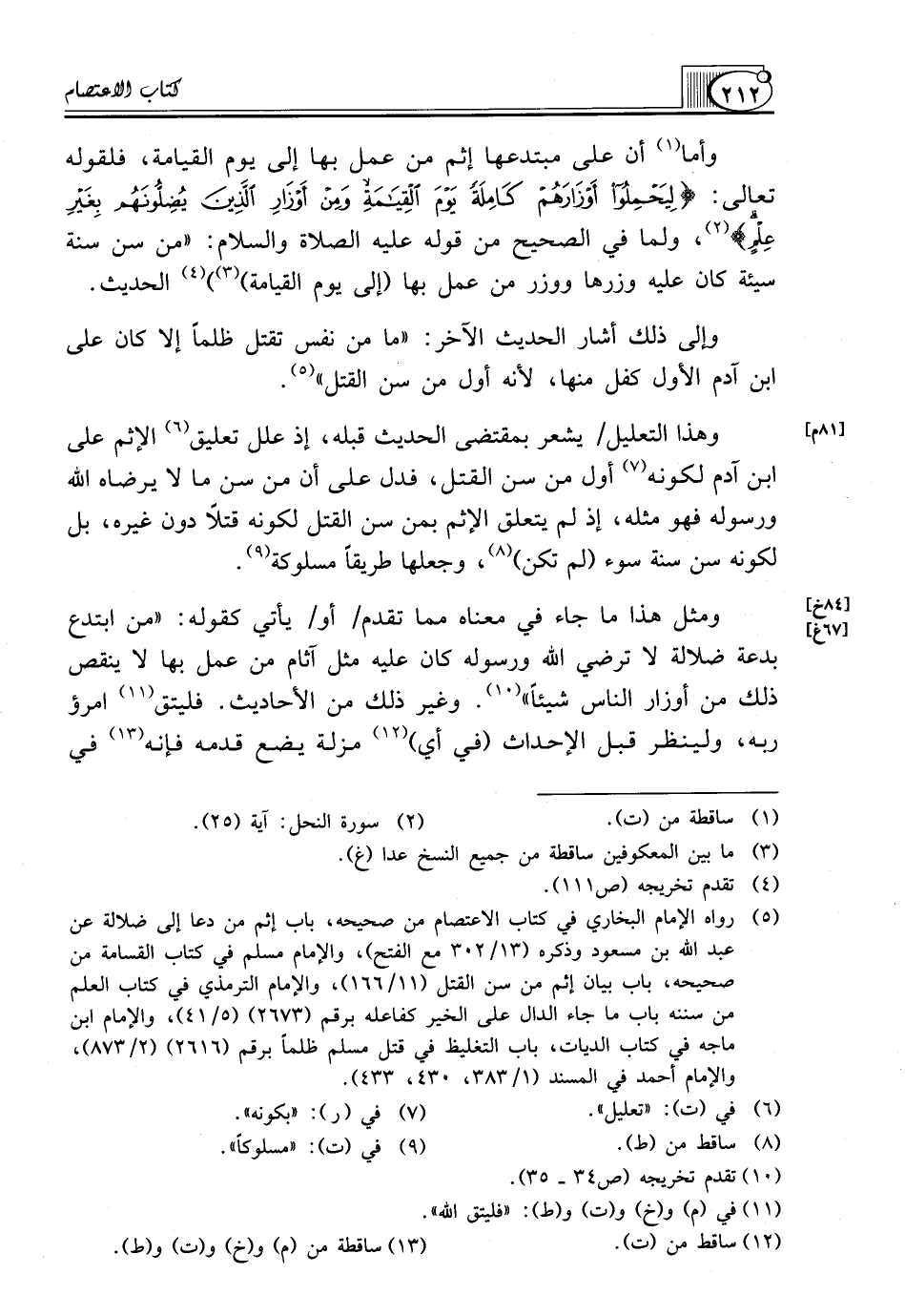 (¬5) رواه الإمام البخاري في كتاب الاعتصام من صحيحه، باب إثم من دعا إلى ضلالة عن عبد الله بن مسعود وذكره (13/ 302 مع الفتح)، والإمام مسلم في كتاب القسامة من صحيحه، باب بيان إثم من سن القتل (11/ 166)، والإمام الترمذي في كتاب العلم من سننه باب ما جاء الدال على الخير كفاعله برقم (2673) (5/ 41)، والإمام ابن ماجه في كتاب الديات، باب التغليظ في قتل مسلم ظلماً برقم (2616) (2/ 873)، والإمام أحمد في المسند (1/ 383، 430، 433).