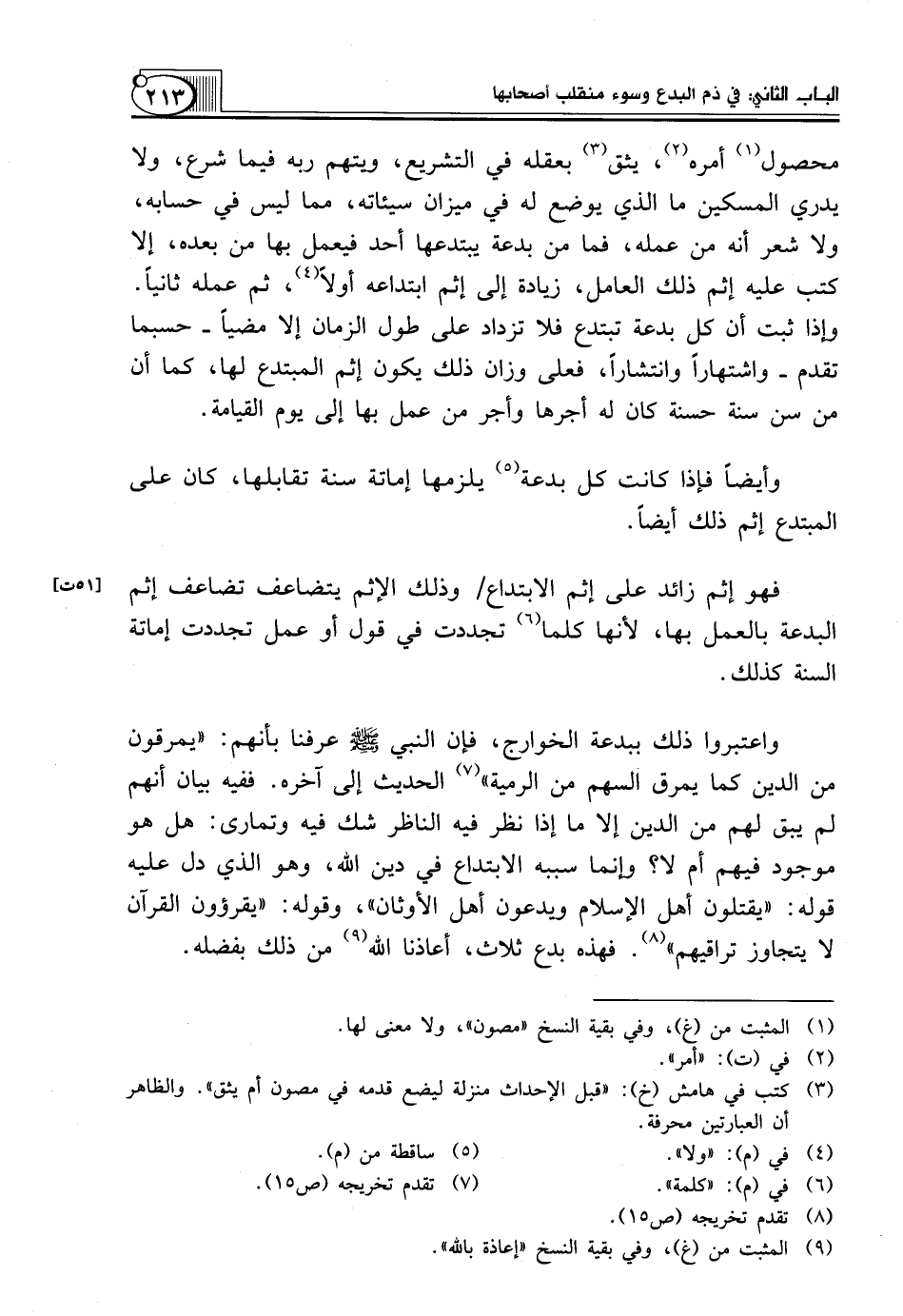 وَاعْتَبَرُوا ذَلِكَ بِبِدْعَةِ الْخَوَارِجِ، فَإِنَّ النَّبِيَّ صَلَّى اللَّهُ عَلَيْهِ وَسَلَّمَ عَرَّفَنَا بِأَنَّهُمْ: "يَمْرُقُونَ مِنَ الدِّينِ كَمَا يَمْرُقُ السَّهْمُ مِنَ الرَّمِيَّةِ" (¬7) الْحَدِيثَ إِلَى آخِرِهِ. فَفِيهِ بَيَانُ أَنَّهُمْ لَمْ يَبْقَ لَهُمْ مِنَ الدِّينِ إِلَّا مَا إِذَا نَظَرَ فِيهِ النَّاظِرُ شَكَّ فِيهِ وَتَمَارَى: هَلْ هُوَ مَوْجُودٌ فِيهِمْ أَمْ لَا؟ وَإِنَّمَا سَبَبُهُ الِابْتِدَاعُ فِي دِينِ اللَّهِ، وَهُوَ الَّذِي دَلَّ عَلَيْهِ قَوْلُهُ: "يَقْتُلُونَ أَهْلَ الْإِسْلَامِ ويدعون أهل الأوثان"، وقوله: "يقرأون الْقُرْآنَ لَا يَتَجَاوَزُ تَرَاقِيَهُمْ" (¬8). فَهَذِهِ بِدَعٌ ثَلَاثٌ، أعاذنا الله (¬9) من ذلك بفضله.