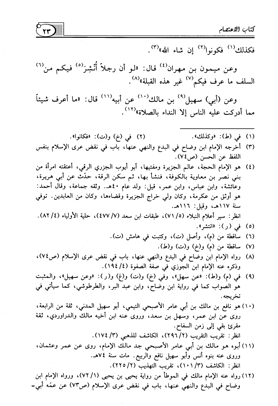 وَعَنْ مَيْمُونِ بْنِ مِهْرَانَ (¬4) قَالَ: "لَوْ أَنَّ رَجُلًا أُنْشِرَ (¬5) فِيكُمْ من (¬6) السلف ما عرف فيكم (¬7) غير هذه القبلة" (¬8).
