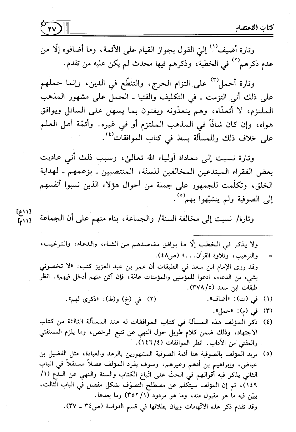 (¬5) يريد المؤلف بالصوفية هنا أئمة الصوفية المشهورين بالزهد والعبادة، مثل الفضيل بن عياض، وإبراهيم بن أدهم وغيرهم، وسوف يفرد المؤلف فصلاً مستقلاً في الباب الثاني يذكر فيه أقوالهم في الحثّ على اتّباع الكتاب والسنة والنهي عن البدع (ص160)، ثم إن المؤلف سيتكلم عن مصطلح التصوّف بشكل مفصل في الباب الثالث، يبيّن فيه ما هو مقبول منه، وما هو مردود (ص383) وما بعده.