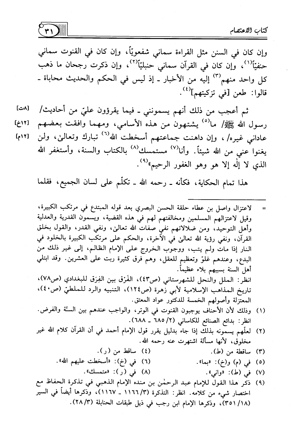 ثُمَّ أعجب من ذلك أنهم يسمونني ـ فيما يقرؤون عَلَيَّ مِنْ أَحَادِيثِ رَسُولِ اللَّهِ صَلَّى اللَّهُ عَلَيْهِ وَسَلَّمَ مَا (¬5) يَشْتَهُونَ مِنْ هَذِهِ الْأَسَامِي، وَمَهْمَا وَافَقْتُ بَعْضَهُمْ عَادَانِي غَيْرُهُ، وَإِنْ دَاهَنْتُ جَمَاعَتَهُمْ أَسْخَطْتُ اللَّهَ (¬6) تَبَارَكَ وَتَعَالَى، وَلَنْ يُغْنُوا عني من الله شيئاً. وأنا (¬7) مُسْتَمْسِكٌ (¬8) بِالْكِتَابِ وَالسُّنَّةِ، وَأَسْتَغْفِرُ اللَّهَ الَّذِي لَا إِلَهَ إِلَّا هُوَ وَهُوَ الْغَفُورُ الرَّحِيمُ" (¬9).