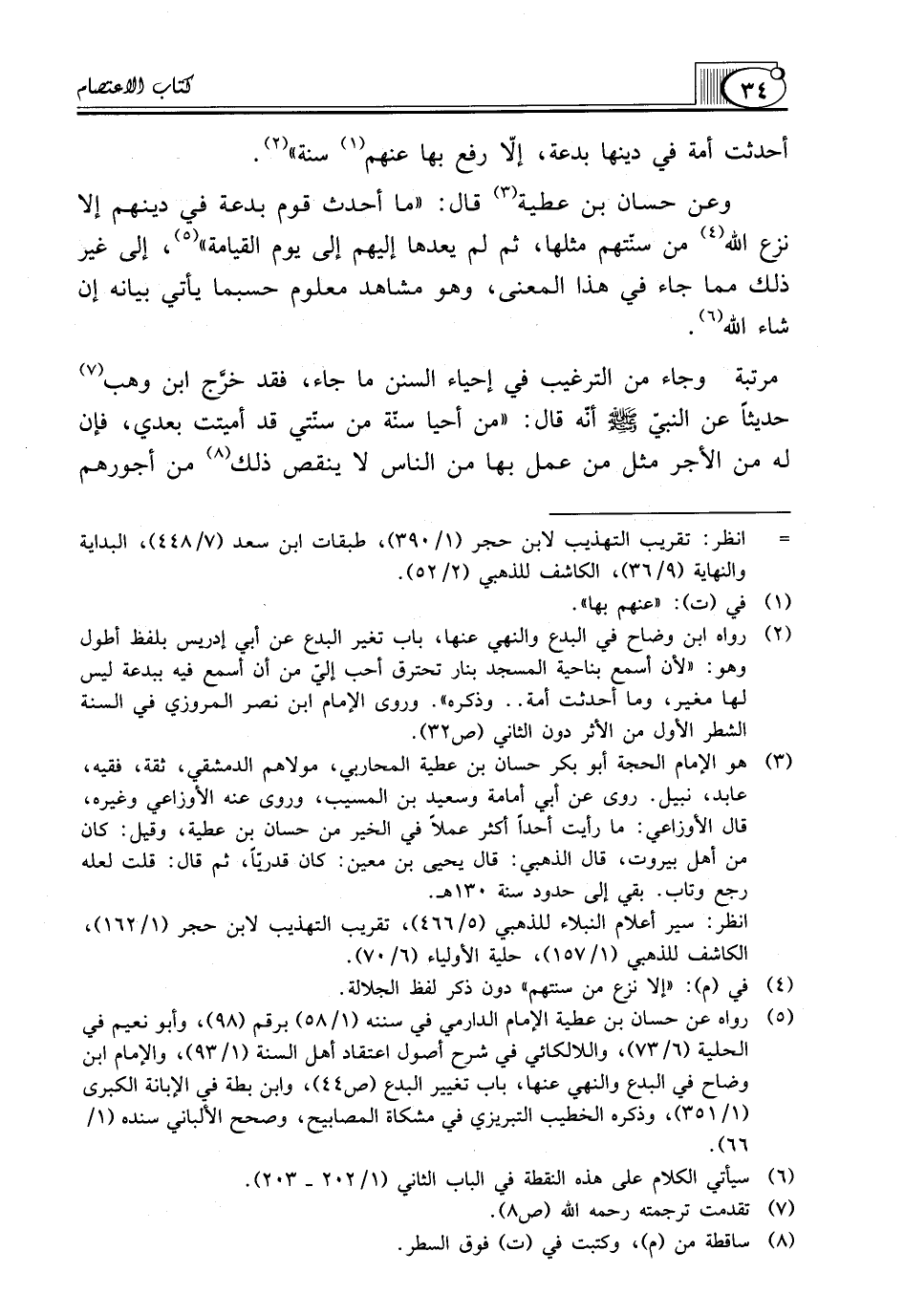 (¬5) رواه عن حسان بن عطية الإمام الدارمي في سننه (1/ 58) برقم (98)، وأبو نعيم في الحلية (6/ 73)، واللالكائي في شرح أصول اعتقاد أهل السنة (1/ 93)، والإمام ابن وضاح في البدع والنهي عنها، باب تغير البدع (ص44)، وابن بطة في الإبانة الكبرى (1/ 351)، وذكره الخطيب التبريزي في مشكاة المصابيح، وصحح الألباني سنده (1/ 66).