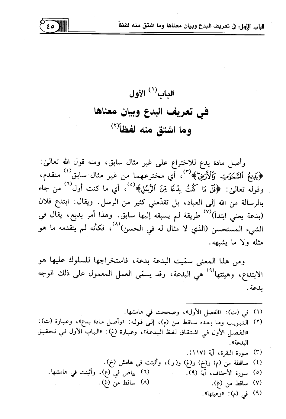 (¬2) التبويب وما بعده ساقط من (م)، إلى قوله: "وأصل مادة بدع"، وعبارة (ت): "الفصل الأول في اشتقاق لفظ البدعة"، وعبارة (غ): "الباب الأول في تحقيق البدعة".