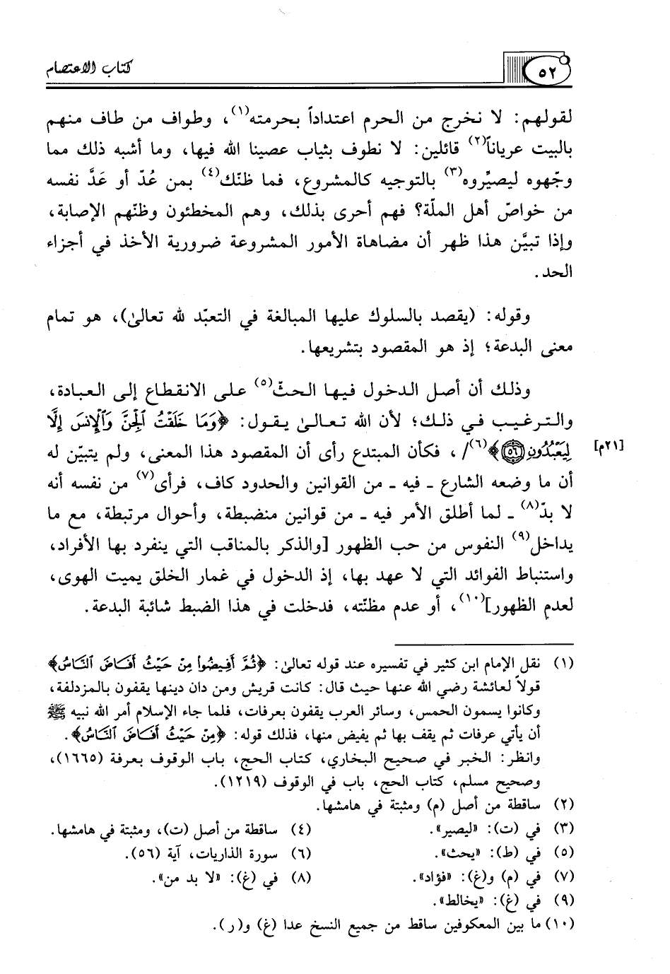 لِقَوْلِهِمْ: لَا نَخْرُجُ مِنَ الْحَرَمِ اعْتِدَادًا بِحُرْمَتِهِ (¬1)، وَطَوَافِ مَنْ طَافَ مِنْهُمْ بِالْبَيْتِ عُرْيَانًا (¬2) قَائِلِينَ: لَا نَطُوفُ بِثِيَابٍ عَصَيْنَا اللَّهَ فِيهَا، وَمَا أَشْبَهَ ذَلِكَ مِمَّا وَجَّهُوهُ ليصيِّروه (¬3) بِالتَّوْجِيهِ كَالْمَشْرُوعِ، فَمَا ظَنُّكَ (¬4) بِمَنْ عُدّ أَوْ عَدَّ نَفْسَهُ مِنْ خَوَاصِّ أَهْلِ الْمِلَّةِ؟ فَهُمْ أَحْرَى بِذَلِكَ، وَهُمُ الْمُخْطِئُونَ وَظَنُّهُمُ الْإِصَابَةَ، وَإِذَا تبيَّن هَذَا ظَهَرَ أَنَّ مُضَاهَاةَ الْأُمُورِ الْمَشْرُوعَةِ ضَرُورِيَّةُ الْأَخْذِ فِي أَجْزَاءِ الْحَدِّ.