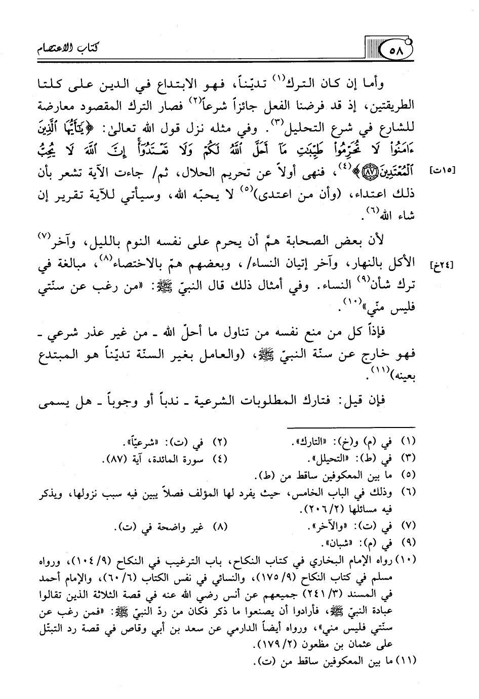 (¬10) رواه الإمام البخاري في كتاب النكاح، باب الترغيب في النكاح (9/ 104)، ورواه مسلم في كتاب النكاح (9/ 175)، والنسائي في نفس الكتاب (6/ 60)، والإمام أحمد في المسند (3/ 241) جميعهم عن أنس رضي الله عنه في قصة الثلاثة الذين تقالوا عبادة النبيّ صلّى الله عليه وسلّم، فأرادوا أن يصنعوا ما ذكر فكان من ردّ النبيّ صلّى الله عليه وسلّم: "فمن رغب عن سنّتي فليس مني"، ورواه أيضاً الدارمي عن سعد بن أبي وقاص في قصة رد التبتّل على عثمان بن مظعون (2/ 179).