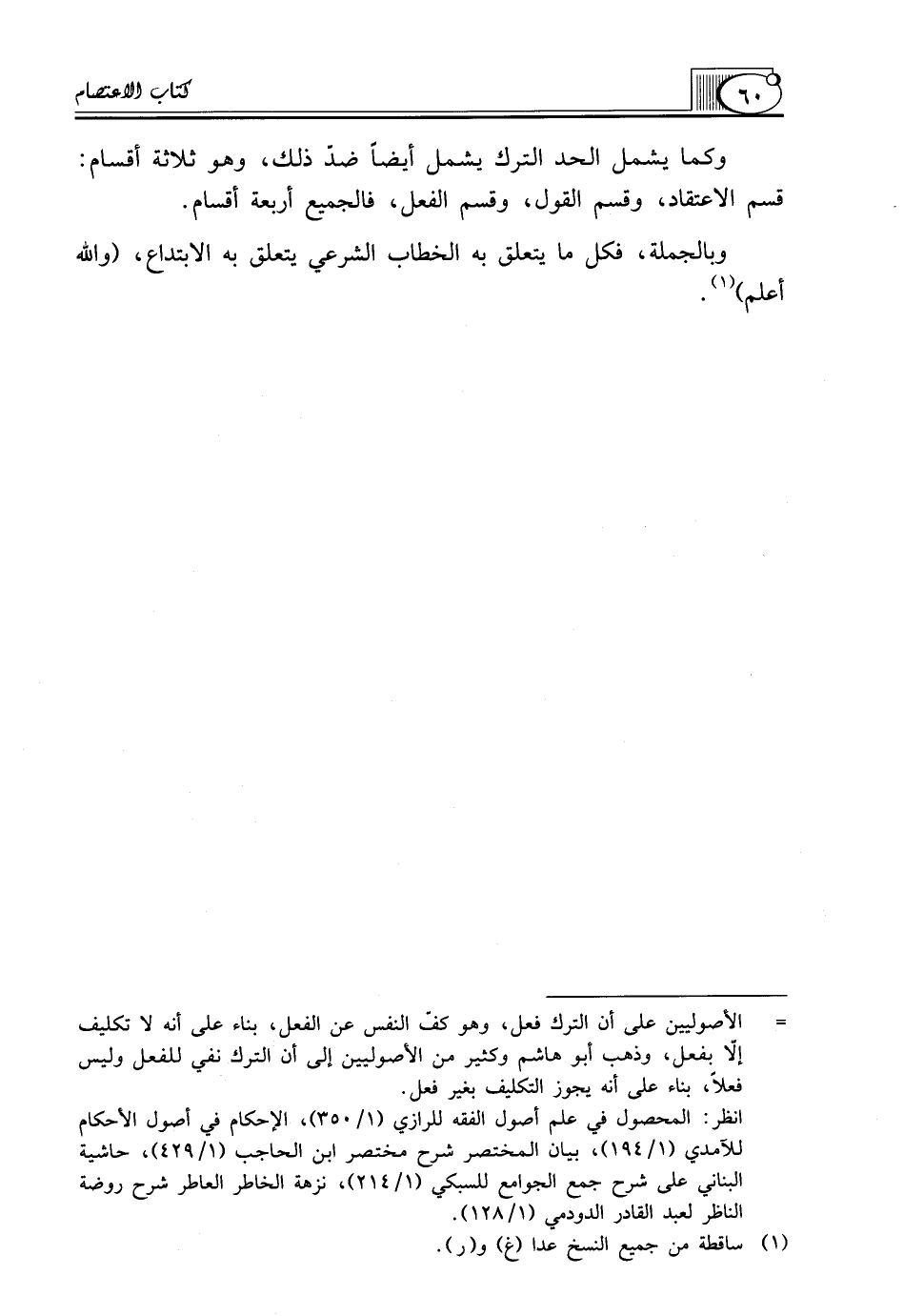 = الأصوليين على أن الترك فعل، وهو كفّ النفس عن الفعل، بناء على أنه لا تكليف إلاّ بفعل، وذهب أبو هاشم وكثير من الأصوليين إلى أن الترك نفي للفعل وليس فعلاً، بناء على أنه يجوز التكليف بغير فعل.