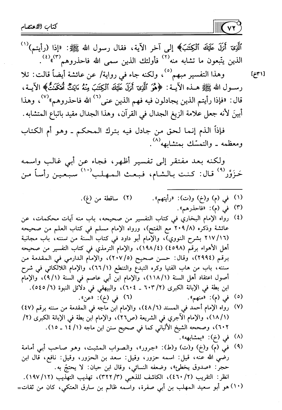 فَإِذًا الذَّمُّ إِنَّمَا لَحِقَ مَنْ جَادَلَ فِيهِ بِتَرْكِ الْمُحْكَمِ ـ وَهُوَ أُمُّ الْكِتَابِ وَمُعْظَمُهُ ـ وَالتَّمَسُّكِ بِمُتَشَابِهِهِ (¬8).