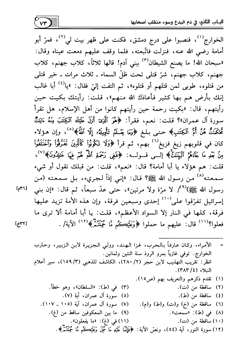 الْخَوَارِجِ (¬1)، فَنُصِبُوا عَلَى دَرَجِ دِمَشْقَ، فَكُنْتُ عَلَى ظهر بيت لي (¬2)، فمرّ أبو أمامة رضي الله عنه، فَنَزَلْتُ فَاتَّبَعْتُهُ، فَلَمَّا وَقَفَ عَلَيْهِمْ دَمَعَتْ عَيْنَاهُ وقال: "سبحان الله! ما يصنع الشيطان (¬3) بِبَنِي آدَمَ! قَالَهَا ثَلَاثًا، كِلَابُ جَهَنَّمَ، كِلَابُ جَهَنَّمَ، كِلَابُ جَهَنَّمَ، شَرُّ قَتْلَى تَحْتَ ظِلِّ السَّمَاءِ ـ ثَلَاثَ مَرَّاتٍ ـ خَيْرُ قَتْلَى مَنْ قَتَلُوهُ، طُوبَى لِمَنْ قَتَلَهُمْ أَوْ قَتَلُوهُ"، ثُمَّ الْتَفَتَ إليّ فقال: "يا (¬4) أَبَا غَالِبٍ إِنَّكَ بِأَرْضٍ هُمْ بِهَا كَثِيرٌ فَأَعَاذَكَ اللَّهُ مِنْهُمْ"، قُلْتُ: رَأَيْتُكَ بَكَيْتَ حِينَ رَأَيْتَهُمْ، قَالَ: "بَكَيْتُ رَحْمَةً حِينَ رَأَيْتُهُمْ كَانُوا مِنْ أَهْلِ الْإِسْلَامِ، هَلْ تَقْرَأُ سُورَةَ آلِ عِمْرَانَ"؟ قُلْتُ: نَعَمْ، فَقَرَأَ: {هُوَ الَّذِي أَنْزَلَ عَلَيْكَ الْكِتَابَ مِنْهُ آيَاتٌ مُحْكَمَاتٌ هُنَّ أُمُّ الْكِتَابِ} حَتَّى بَلَغَ {وَمَا يَعْلَمُ تَأْوِيلَهُ إِلاَّ اللَّهُ} (¬5)، وَإِنَّ هَؤُلَاءِ كَانَ فِي قُلُوبِهِمْ زَيْغٌ فَزِيغَ (¬6) بِهِمْ، ثُمَّ قَرَأَ {وَلاَ تَكُونُوا كَالَّذِينَ تَفَرَّقُوا وَاخْتَلَفُوا مِنْ بَعْدِ مَا جَاءَهُمُ الْبَيِّنَاتُ} إِلَى قَوْلِهِ: {فَفِي رَحْمَةِ اللَّهِ هُمْ فِيهَا خَالِدُونَ} (¬7)، قُلْتُ: هُمْ هَؤُلَاءِ يَا أَبَا أُمَامَةَ؟ قَالَ: "نَعَمْ"، قُلْتُ: مِنْ قِبَلِكَ تَقُولُ أَوْ شَيْءٌ سَمِعْتُهُ (¬8) مِنْ رَسُولِ اللَّهِ صَلَّى اللَّهُ عَلَيْهِ وَسَلَّمَ؟ قَالَ: "إِنِّي إِذًا لَجَرِيءٌ، بَلْ سَمِعْتُهُ (مِنْ رَسُولِ اللَّهِ صَلَّى اللَّهُ عَلَيْهِ وَسَلَّمَ) (¬9) لَا مَرَّةً وَلَا مَرَّتَيْنِ"، حَتَّى عَدَّ سَبْعًا، ثُمَّ قَالَ: "إِنَّ بَنِي إِسْرَائِيلَ تَفَرَّقُوا عَلَى (¬10) إِحْدَى وَسَبْعِينَ فِرْقَةً، وَإِنَّ هَذِهِ الْأُمَّةَ تَزِيدُ عَلَيْهَا فِرْقَةً، كُلُّهُا فِي النَّارِ إِلَّا السَّوَادُ الْأَعْظَمُ"، قُلْتُ: يَا أَبَا أُمَامَةَ أَلَا تَرَى ما فعلوا؟ (¬11) قال: عليهم ما حملوا {وَعَلَيْكُمْ مَا حُمِّلْتُمْ} (¬12) الآية.