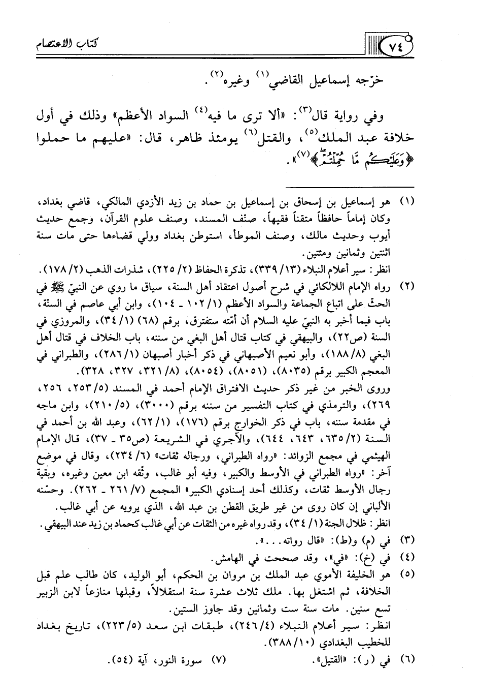 (¬2) رواه الإمام اللالكائي في شرح أصول اعتقاد أهل السنة، سياق ما روي عن النبيّ صلّى الله عليه وسلّم في الحثّ على اتباع الجماعة والسواد الأعظم (1/ 102 ـ 104)، وابن أبي عاصم في السنّة، باب فيما أخبر به النبيّ عليه السلام أن أمّته ستفترق، برقم (68) (1/ 34)، والمروزي في السنة (ص22)، والبيهقي في كتاب قتال أهل البغي من سننه، باب الخلاف في قتال أهل البغي (8/ 188)، وأبو نعيم الأصبهاني في ذكر أخبار أصبهان (1/ 286)، والطبراني في المعجم الكبير برقم (8035)، (8051)، (8054)، (8/ 321، 327، 328).