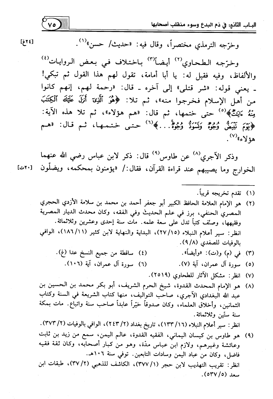 (¬8) هو الإمام المحدث القدوة، شيخ الحرم الشريف، أبو بكر محمد بن الحسين بن عبد الله البغدادي الآجري، صاحب التواليف، منها كتاب الشريعة في السنة وكتاب الثمانين، وأخلاق العلماء، وكان صدوقاً خيّراً عابداً صاحب سنة واتباع. مات بمكة سنة ستّين وثلاثمائة.