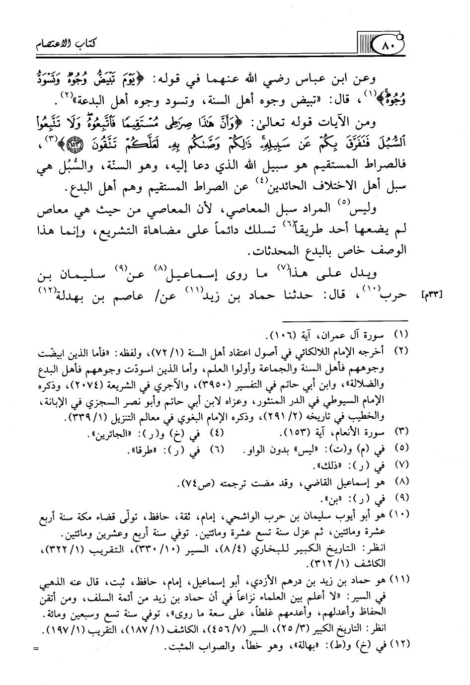 (¬11) هو حماد بن زيد بن درهم الأزدي، أبو إسماعيل، إمام، حافظ، ثبت، قال عنه الذهبي في السير: "لا أعلم بين العلماء نزاعاً في أن حماد بن زيد من أئمة السلف، ومن أتقن الحفاظ وأعدلهم، وأعدمهم غلطاً، على سعة ما روى"، توفي سنة تسع وسبعين ومائة.