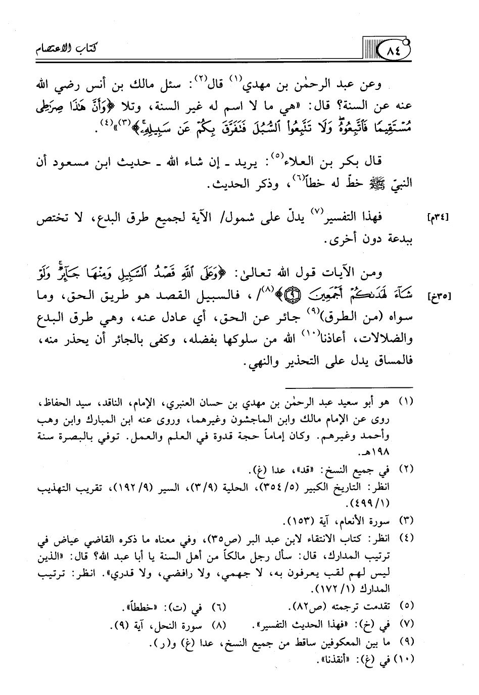 (¬4) انظر: كتاب الانتقاء لابن عبد البر (ص35)، وفي معناه ما ذكره القاضي عياض في ترتيب المدارك، قال: سأل رجل مالكاً من أهل السنة يا أبا عبد الله؟ قال: "الذين ليس لهم لقب يعرفون به، لا جهمي، ولا رافضي، ولا قدري". انظر: ترتيب المدارك (1/ 172).
