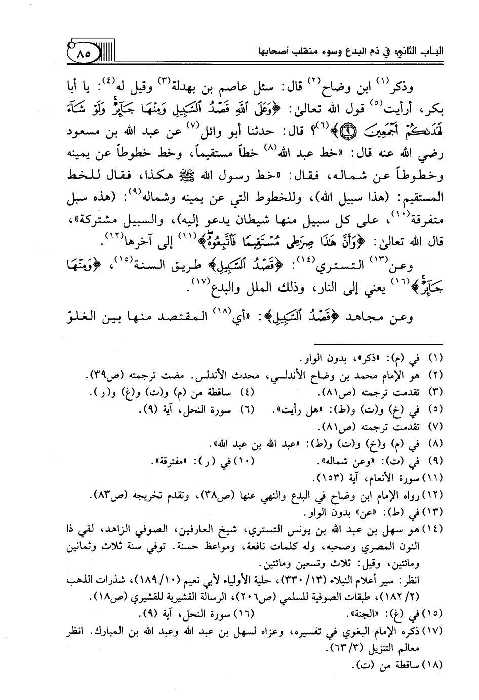 وَذَكَرَ (¬1) ابْنُ وَضَّاحٍ (¬2) قَالَ: سُئِلَ عَاصِمُ بْنُ بهدلة (¬3) وقيل له (¬4): يا أبا بكر، أرأيت (¬5) قول الله تعالى: {وَعَلَى اللَّهِ قَصْدُ السَّبِيلِ وَمِنْهَا جَائِرٌ وَلَوْ شَاءَ لَهَدَاكُمْ أَجْمَعِينَ *} (¬6)؟ قَالَ: حَدَّثَنَا أَبُو وَائِلٍ (¬7) عَنْ عَبْدِ اللَّهِ بن مسعود رضي الله عنه قَالَ: "خَطَّ عَبْدُ اللَّهِ (¬8) خَطًّا مُسْتَقِيمًا، وَخَطَّ خُطُوطًا عَنْ يَمِينِهِ وَخُطُوطًا عَنْ شِمَالِهِ، فَقَالَ: "خَطَّ رَسُولُ اللَّهِ صَلَّى اللَّهُ عَلَيْهِ وَسَلَّمَ هَكَذَا، فَقَالَ لِلْخَطِّ الْمُسْتَقِيمِ (هَذَا سَبِيلُ اللَّهِ)، وَلِلْخُطُوطِ الَّتِي عَنْ يَمِينِهِ وَشِمَالِهِ (¬9) (هَذِهِ سُبُلٌ مُتَفَرِّقَةٌ (¬10)، عَلَى كُلِّ سَبِيلٍ مِنْهَا شَيْطَانٌ يَدْعُو إِلَيْهِ)، وَالسَّبِيلُ مُشْتَرَكَةٌ"، قَالَ اللَّهُ تَعَالَى: {وَأَنَّ هَذَا صِرَاطِي مُسْتَقِيمًا فَاتَّبِعُوهُ} (¬11) إلى آخرها (¬12).
