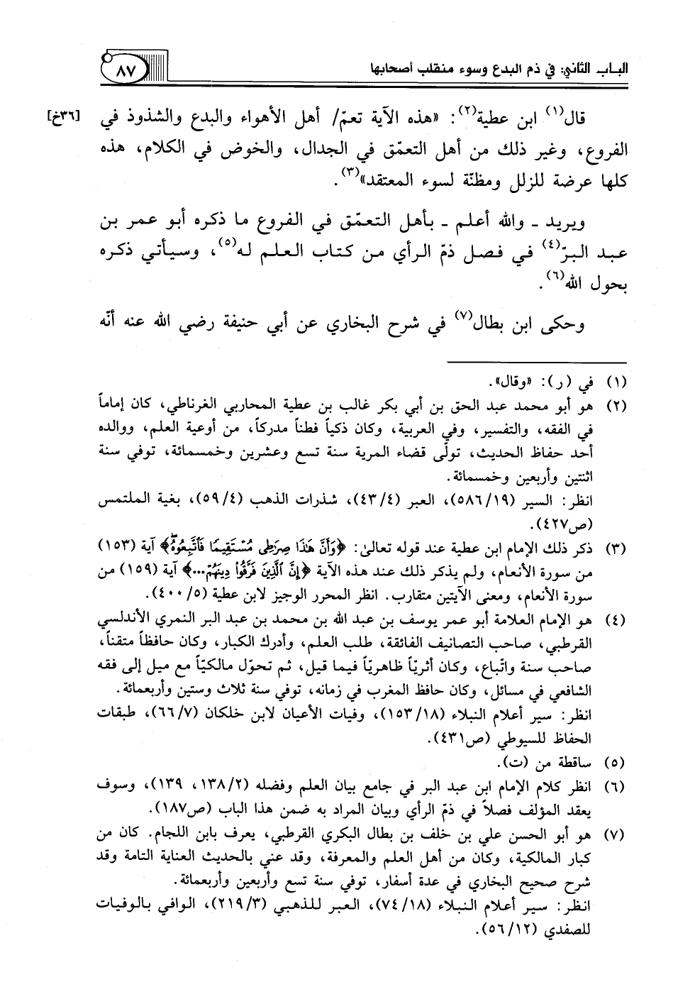 (¬6) انظر كلام الإمام ابن عبد البر في جامع بيان العلم وفضله (2/ 138، 139)، وسوف يعقد المؤلف فصلاً في ذمّ الرأي وبيان المراد به ضمن هذا الباب (ص187).