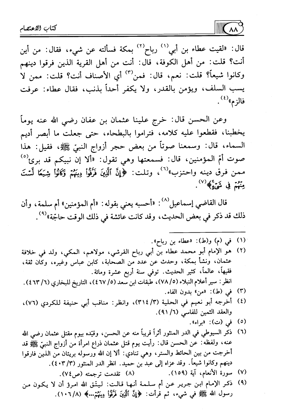 قَالَ: "لَقِيتُ عَطَاءَ بْنَ أَبِي (¬1) رَبَاحٍ (¬2) بِمَكَّةَ فَسَأَلْتُهُ عَنْ شَيْءٍ، فَقَالَ: مِنْ أَيْنَ أَنْتَ؟ قُلْتُ: مِنْ أَهْلِ الْكُوفَةِ، قَالَ: أَنْتَ مِنْ أَهْلِ الْقَرْيَةِ الَّذِينَ فَرَّقُوا دِينَهُمْ وَكَانُوا شِيَعًا؟ قلت: نعم، قال: فمن (¬3) أَيِّ الْأَصْنَافِ أَنْتَ؟ قُلْتُ: مِمَّنْ لَا يَسُبُّ السَّلَفَ، وَيُؤْمِنُ بِالْقَدْرِ، وَلَا يُكَفِّرُ أَحَدًا بِذَنْبٍ، فَقَالَ عَطَاءٌ: عَرَفْتَ فَالْزَمْ" (¬4).