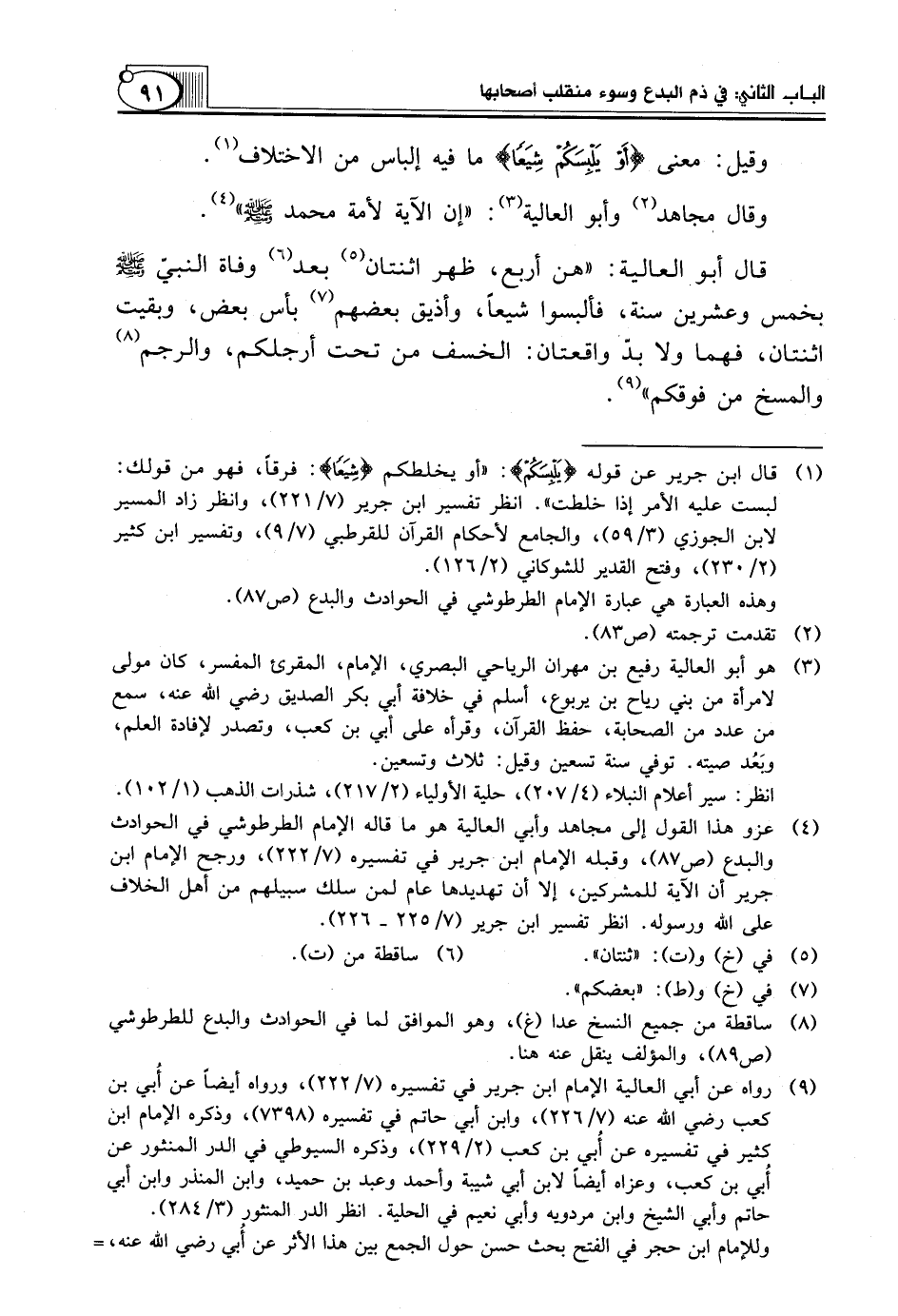 (¬4) عزو هذا القول إلى مجاهد وأبي العالية هو ما قاله الإمام الطرطوشي في الحوادث والبدع (ص87)، وقبله الإمام ابن جرير في تفسيره (7/ 222)، ورجح الإمام ابن جرير أن الآية للمشركين، إلا أن تهديدها عام لمن سلك سبيلهم من أهل الخلاف على الله ورسوله. انظر تفسير ابن جرير (7/ 225 ـ 226).