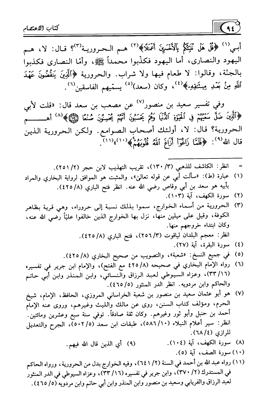 وَفِي تَفْسِيرِ سَعِيدِ بْنِ مَنْصُورٍ (¬7) عَنْ مُصْعَبِ بْنِ سَعْدٍ قَالَ: "قُلْتُ لِأَبِي {الَّذِينَ ضَلَّ سَعْيُهُمْ فِي الْحَيَاةِ الدُّنْيَا وَهُمْ يَحْسَبُونَ أَنَّهُمْ يُحْسِنُونَ صُنْعًا *} (¬8) أَهُمُ الْحَرُورِيَّةُ؟ قَالَ: لَا، أُولَئِكَ أَصْحَابُ الصَّوَامِعِ. ولكن الحرورية الذين قال الله (¬9): {فَلَمَّا زَاغُوا أَزَاغَ اللَّهُ قُلُوبَهُمْ} (¬10) " (¬11).