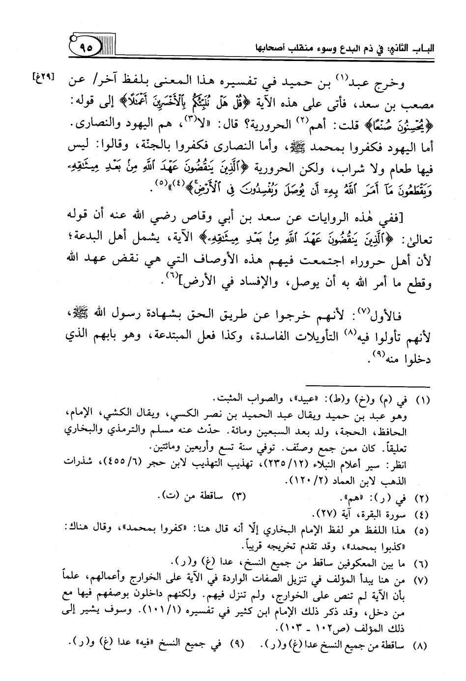 (¬7) من هنا يبدأ المؤلف في تنزيل الصفات الواردة في الآية على الخوارج وأعمالهم، علماً بأن الآية لم تنص على الخوارج، ولم تنزل فيهم. ولكنهم داخلون بوصفهم فيها مع من دخل، وقد ذكر ذلك الإمام ابن كثير في تفسيره (1/ 101). وسوف يشير إلى ذلك المؤلف (ص105).