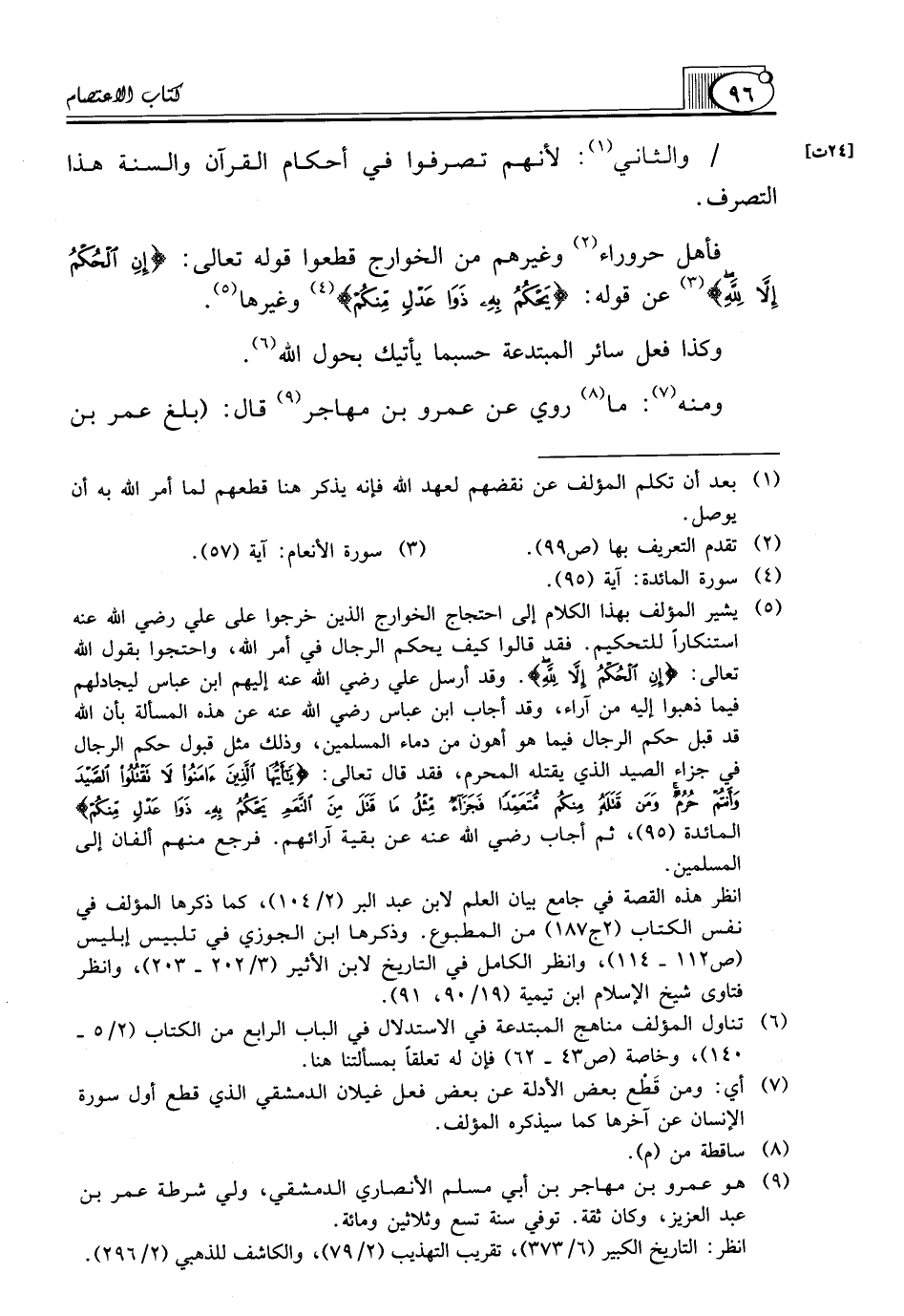 (¬5) يشير المؤلف بهذا الكلام إلى احتجاج الخوارج الذين خرجوا على علي رضي الله عنه استنكاراً للتحكيم. فقد قالوا كيف يحكم الرجال في أمر الله، واحتجوا بقول الله تعالى: {إِنِ الْحُكْمُ إِلاَّ لِلَّهِ}. وقد أرسل علي رضي الله عنه إليهم ابن عباس ليجادلهم فيما ذهبوا إليه من آراء، وقد أجاب ابن عباس رضي الله عنه عن هذه المسألة بأن الله قد قبل حكم الرجال فيما هو أهون من دماء المسلمين، وذلك مثل قبول حكم الرجال في جزاء الصيد الذي يقتله المحرم، فقد قال تعالى: {يَا أَيُّهَا الَّذِينَ آمَنُوا لاَ تَقْتُلُوا الصَّيْدَ وَأَنْتُمْ حُرُمٌ وَمَنْ قَتَلَهُ مِنْكُمْ مُتَعَمِّدًا فَجَزَاءٌ مِثْلُ مَا قَتَلَ مِنَ النَّعَمِ يَحْكُمُ بِهِ ذَوَا عَدْلٍ مِنْكُمْ} المائدة (95)، ثم أجاب رضي الله عنه عن بقية آرائهم. فرجع منهم ألفان إلى المسلمين.