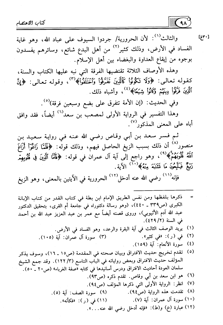 (¬5) تقدم تخريج حديث الافتراق وبيان صحته في المقدمة (ص12)، وسوف يذكر المؤلف حديث الافتراق وبعض رواياته في الباب التاسع (2/ 189) من المطبوع. وقد جمع الشيخ سلمان العودة أحاديث الافتراق ودرس أسانيدها في كتابه "صفة الغرباء" (ص20 ـ 50).