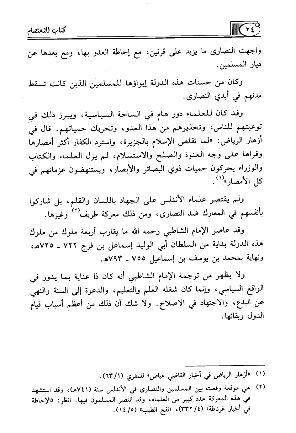 ولا يظهر من ترجمة الإمام الشاطبي أنه كان ذا عناية بما يدور في الواقع السياسي، وإنما كان شغله العلم والتعليم، والدعوة إلى السنة والنهي عن البدع، والاجتهاد في الإصلاح. ولا شك أن ذلك من أعظم أسباب قيام الدول وبقائها.